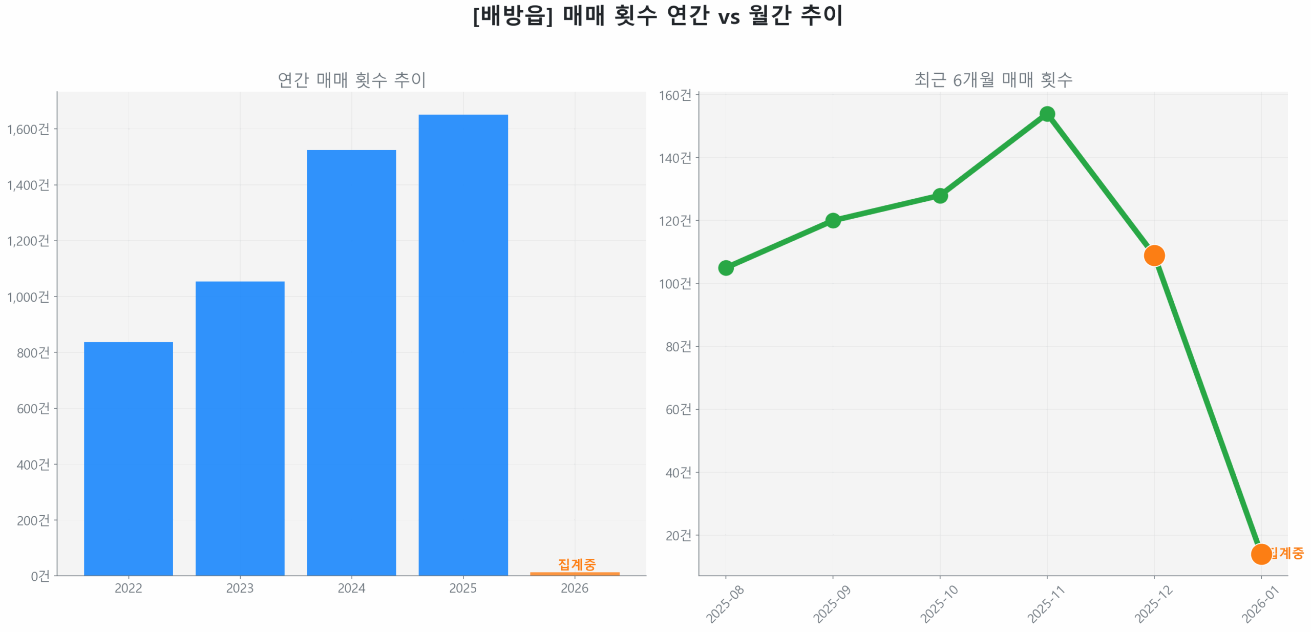 최신 실거래 데이터에 따르면, 최근 3개월(2025년 10월~12월) 거래량은 130건으로 전 분기 대비 32.1% 급증하며 시장의 핵심 동력으로 작용하고 있습니다. 하지만 같은 기간 평균 가격은 0.3% 상승에 그쳐 거래량 증가가 가격 상승으로 이어지지 않는 비동조화 현상이 나타나고 있습니다.