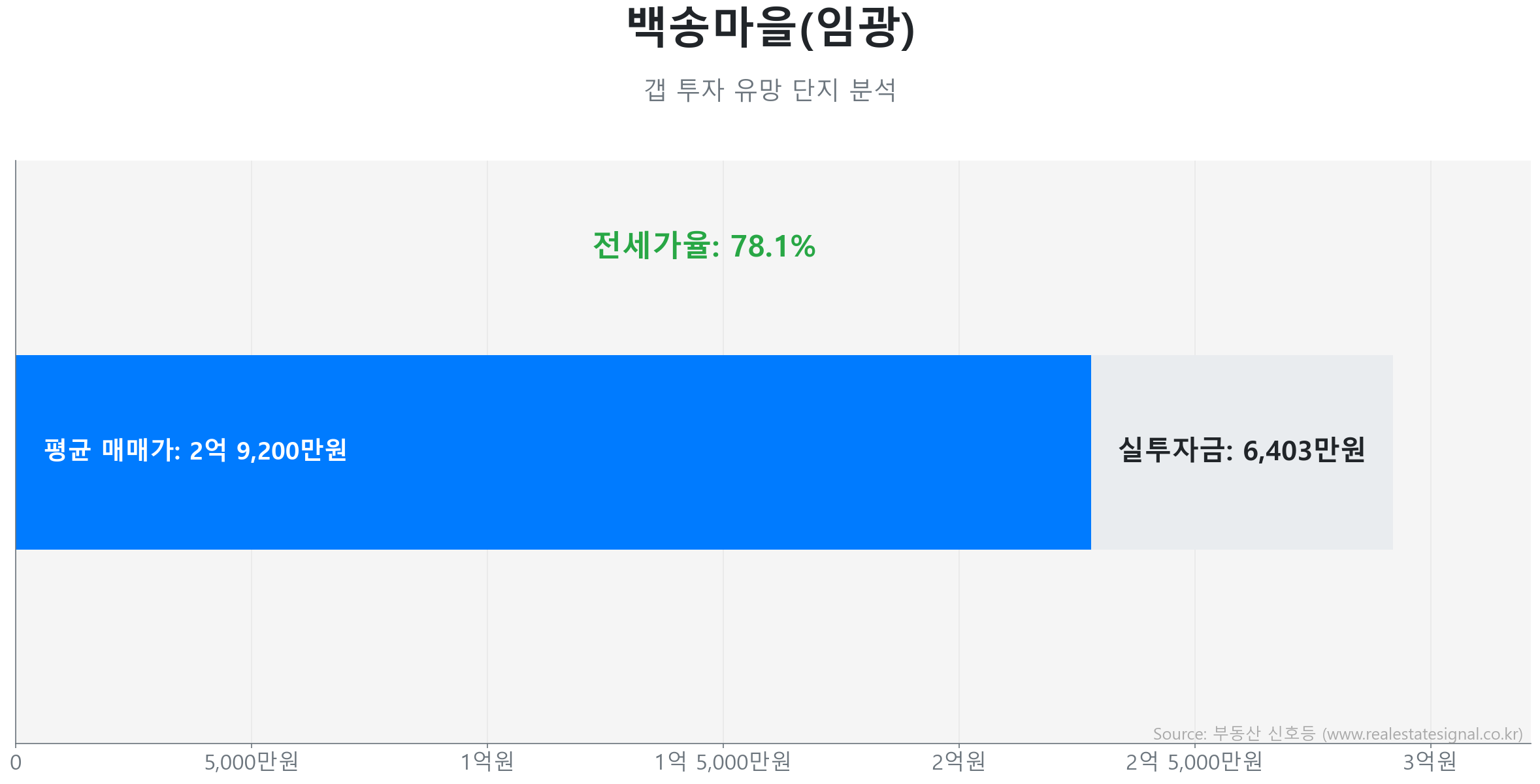 백송마을(임광) 59.0㎡의 갭투자 분석. 전세가율은 78.1%이며 예상 실투자금은 6,403만원.