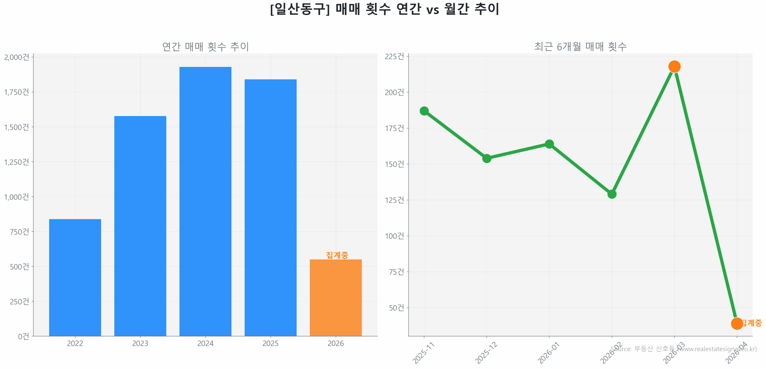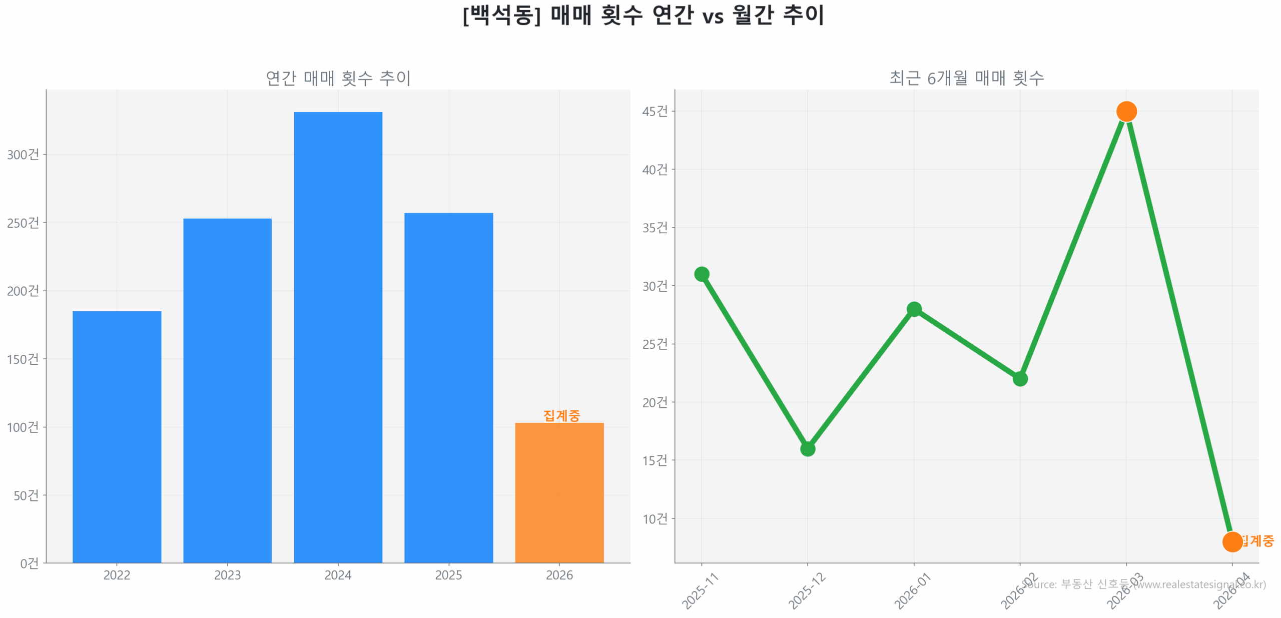 최신 실거래 데이터에 따르면, 2026년 3월 백석동의 거래량은 전월 대비 104.5% 폭증하며 뚜렷한 변곡점을 만들었습니다. 비록 전반적인 수요는 관망세를 보이는 장세지만, 거래가 체결되는 속도는 작년 대비 가파르게 오르며 시장 에너지가 살아나고 있습니다.