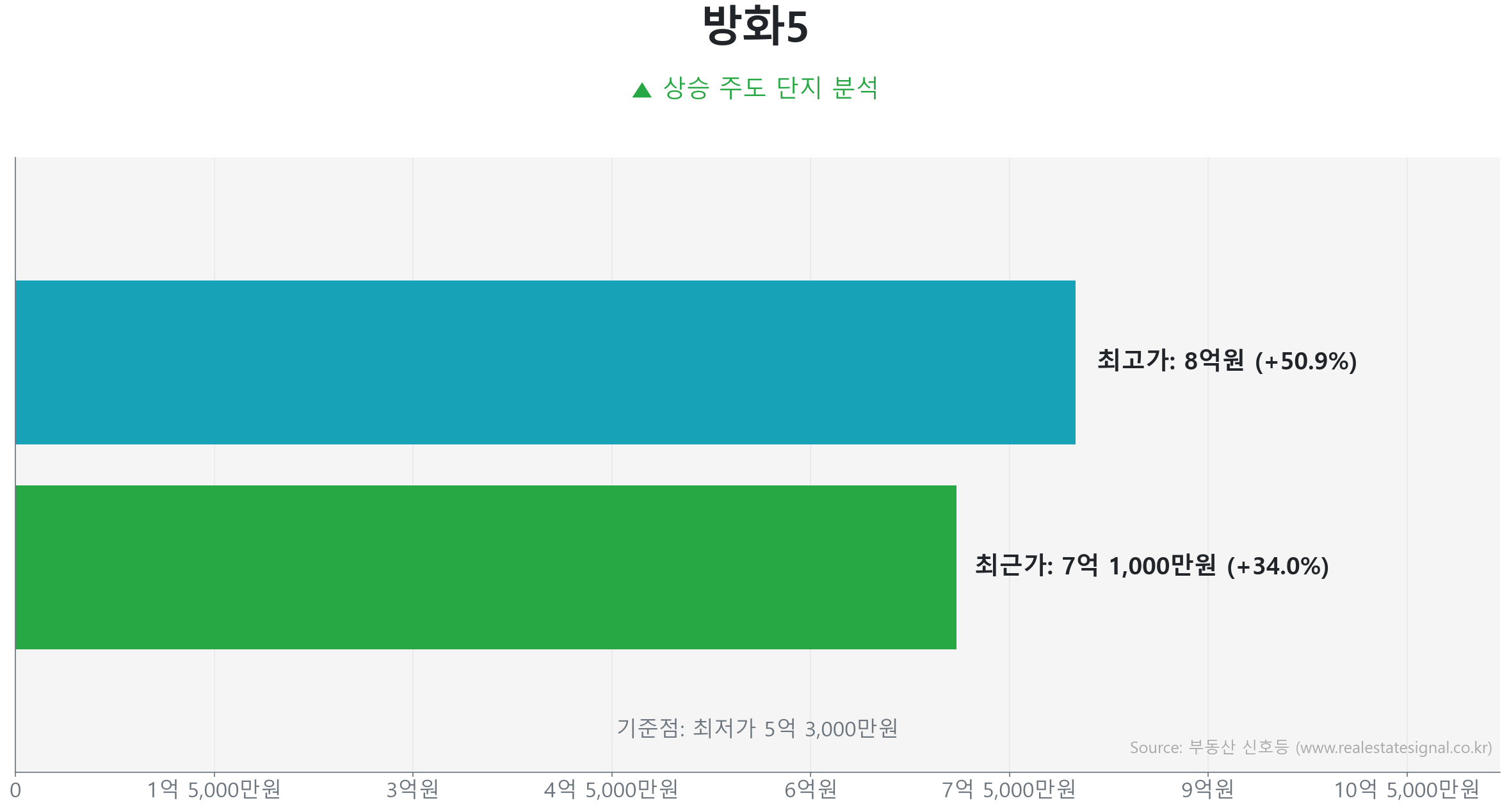 이어서 1372세대 규모의 대단지 방화동 방화5(49.0㎡) 역시 매매가가 전년 대비 7.2% 상승한 가운데, 2026년 3월 매물이 7억 1,000만 원에 신고되었습니다.