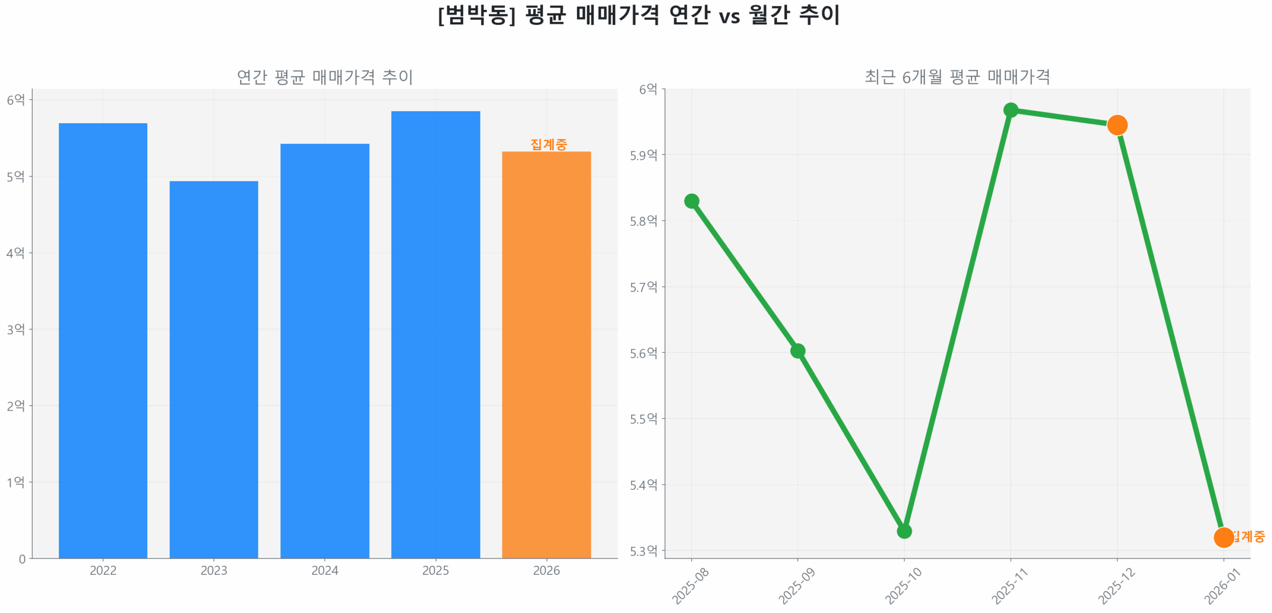 2026년 1월 18일 기준, 범박동 아파트 시세는 2021년 11월 최고점(7억 1,857만 원)과 2024년 1월 최저점(4억 2,790만 원) 사이 하락폭의 57.33%를 회복하며 명확한 회복(Recovery) 국면에 진입했습니다. 이는 시장이 저점 대비 상당 부분 반등했음을 의미하며, 전년 동기 대비 매수 가속도 7.86%를 기록하며 점진적인 가속화 양상도 관측됩니다.