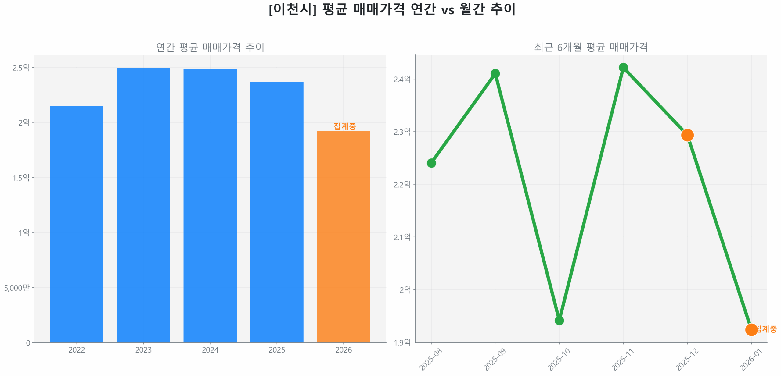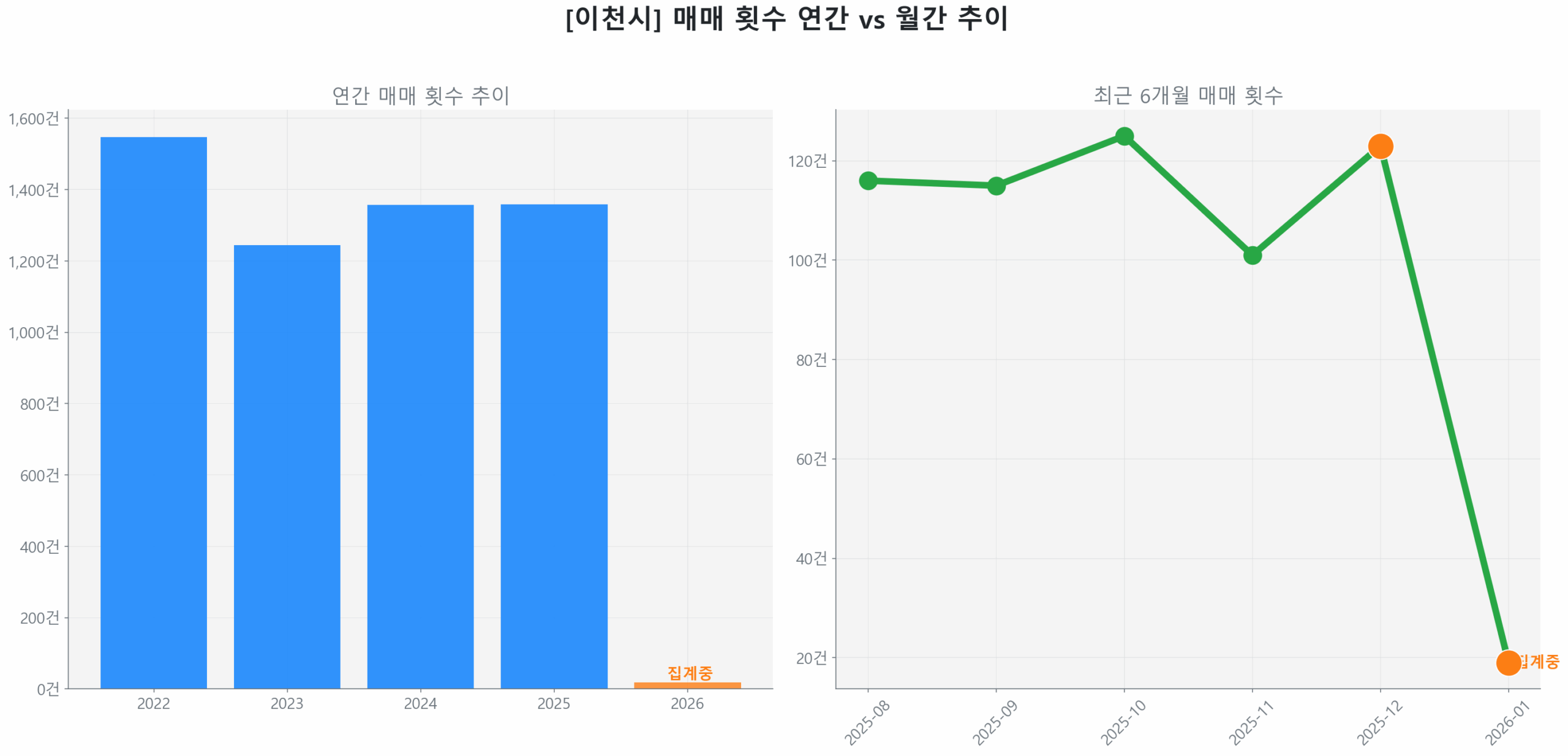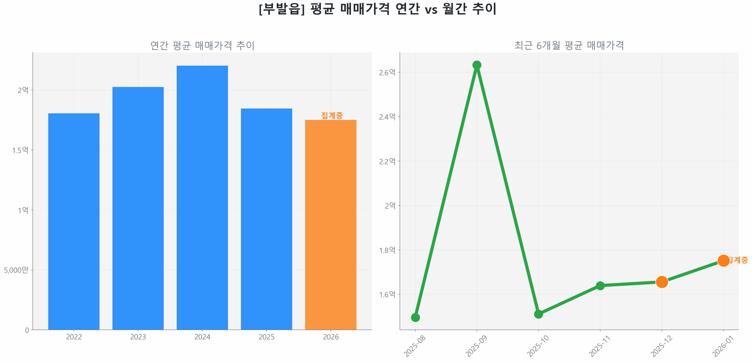 2026년 1월 16일 기준, 이천 부발읍 부동산 투자 시장은 2025년 8월 최저점 대비 11.97% 반등하며 ‘Bottoming’ 국면에 진입, 회복 궤도에 올랐습니다. 전년 동기 대비 매수 가속도는 5.94%를 기록하며 ‘Accelerating’세가 관측되지만, 아직 회복 초기 단계에 머물러 있습니다.