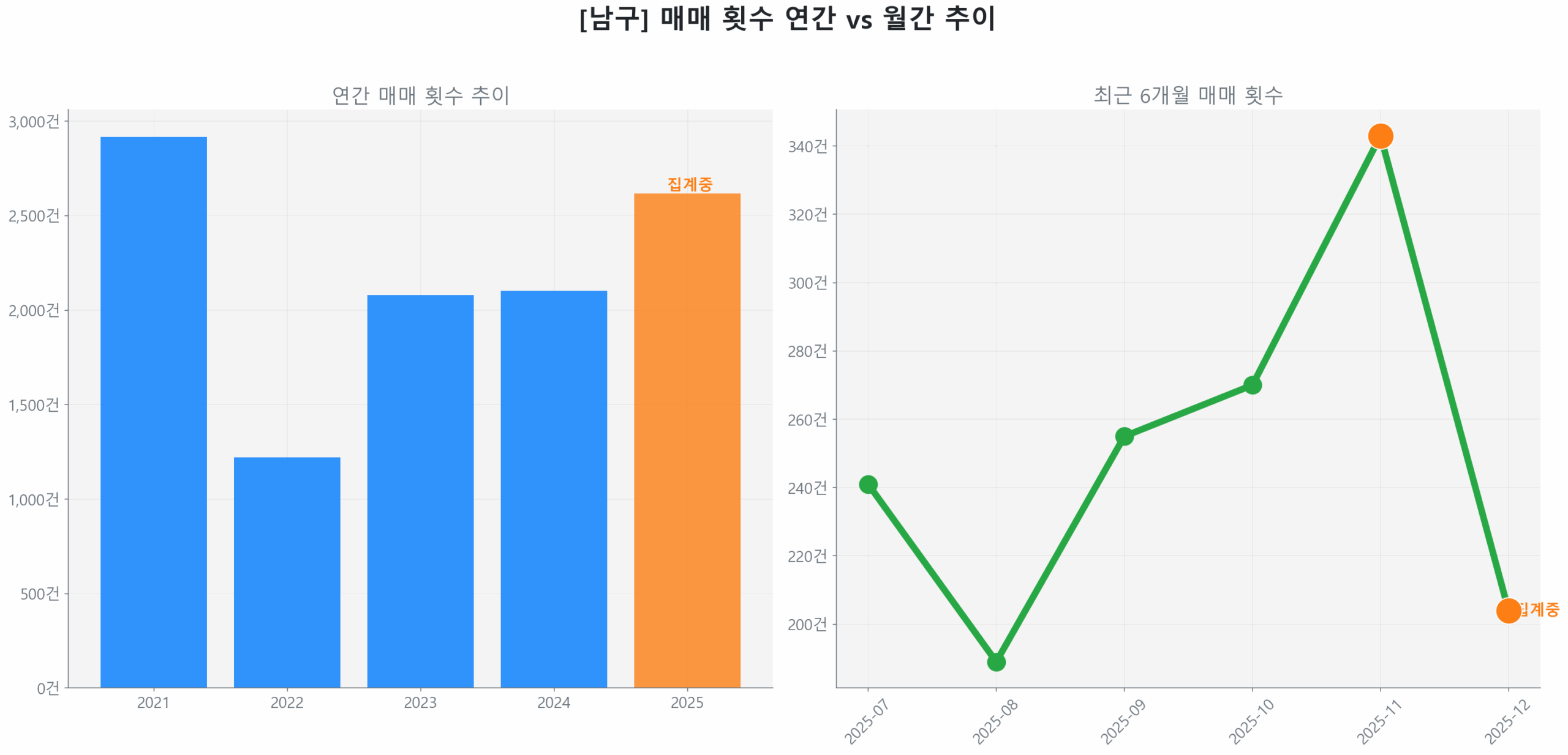 이러한 흐름은 대연극동StarClass (84.0㎡)에서도 확인되는데, 준공 23년 차 구축임에도 전세가율 75.2%로 하방을 지지하며 최근 2억 9,800만 원(2025년 7월)에 거래되는 등 바닥 다지기 이후 소폭 반등을 시도하고 있습니다.
