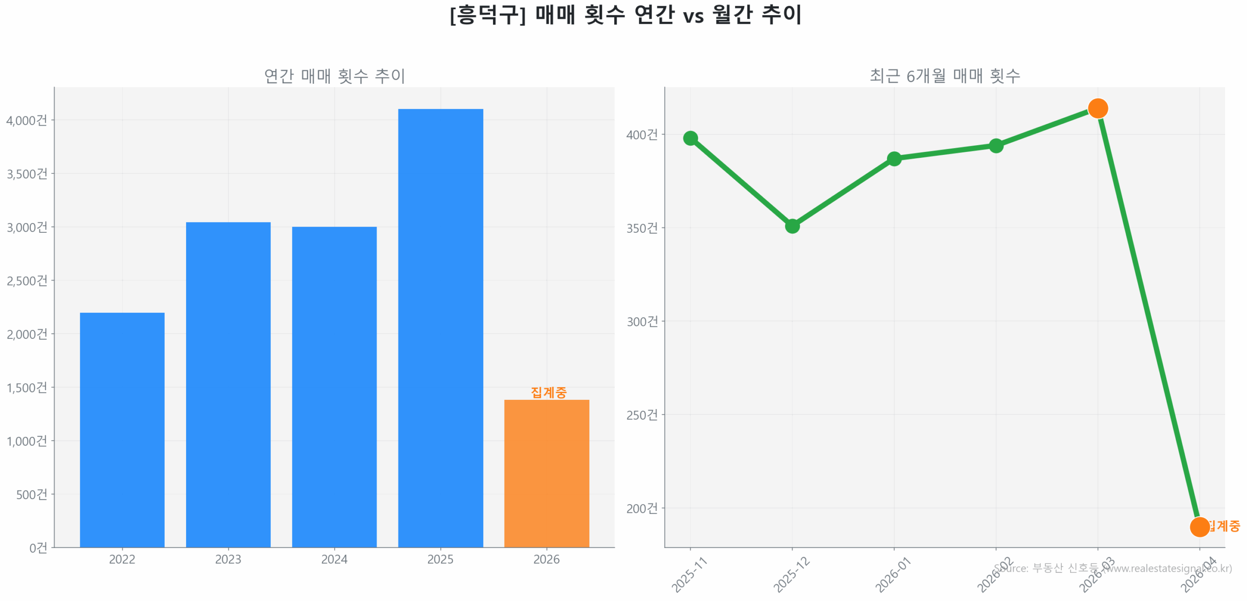 현재 시장의 핵심 동력은 가격이 아닌 ‘거래량’으로, 최근 3개월(1월~3월) 거래량은 40건을 기록하며 전 분기 대비 28.7% 급증하는 양상을 보이고 있습니다. 반면 평균 가격은 2억 9,422만 원으로 1.8% 상승에 그쳐, 시장은 가격 상승에 앞서 쌓여있던 급매물이 소화되는 ‘에너지 축적 단계’에 머물고 있습니다.