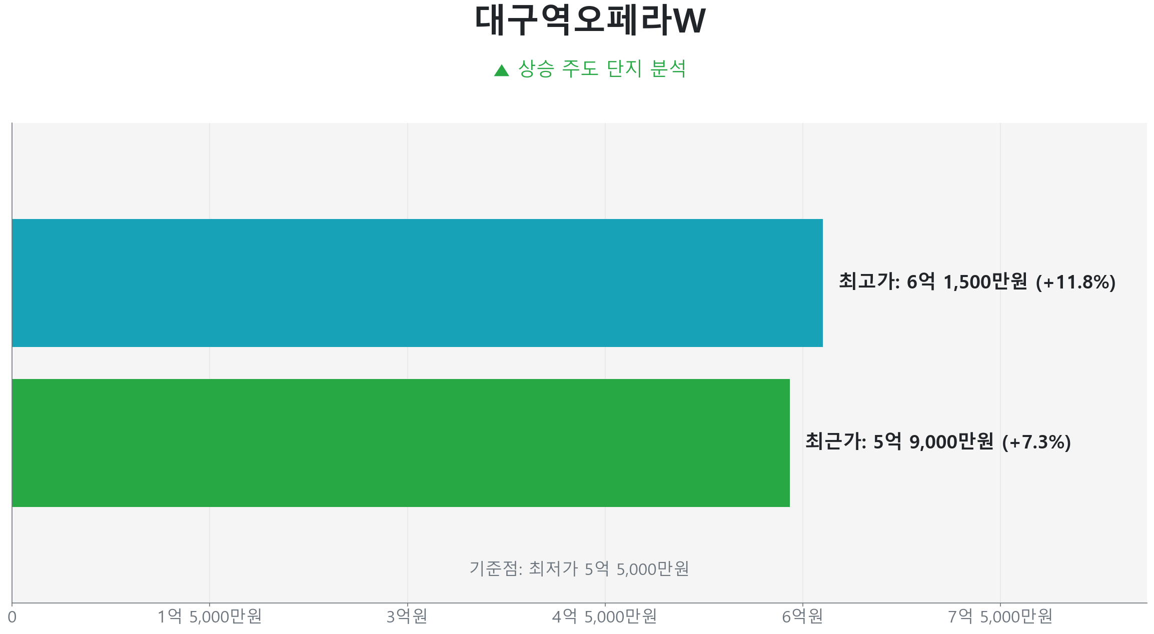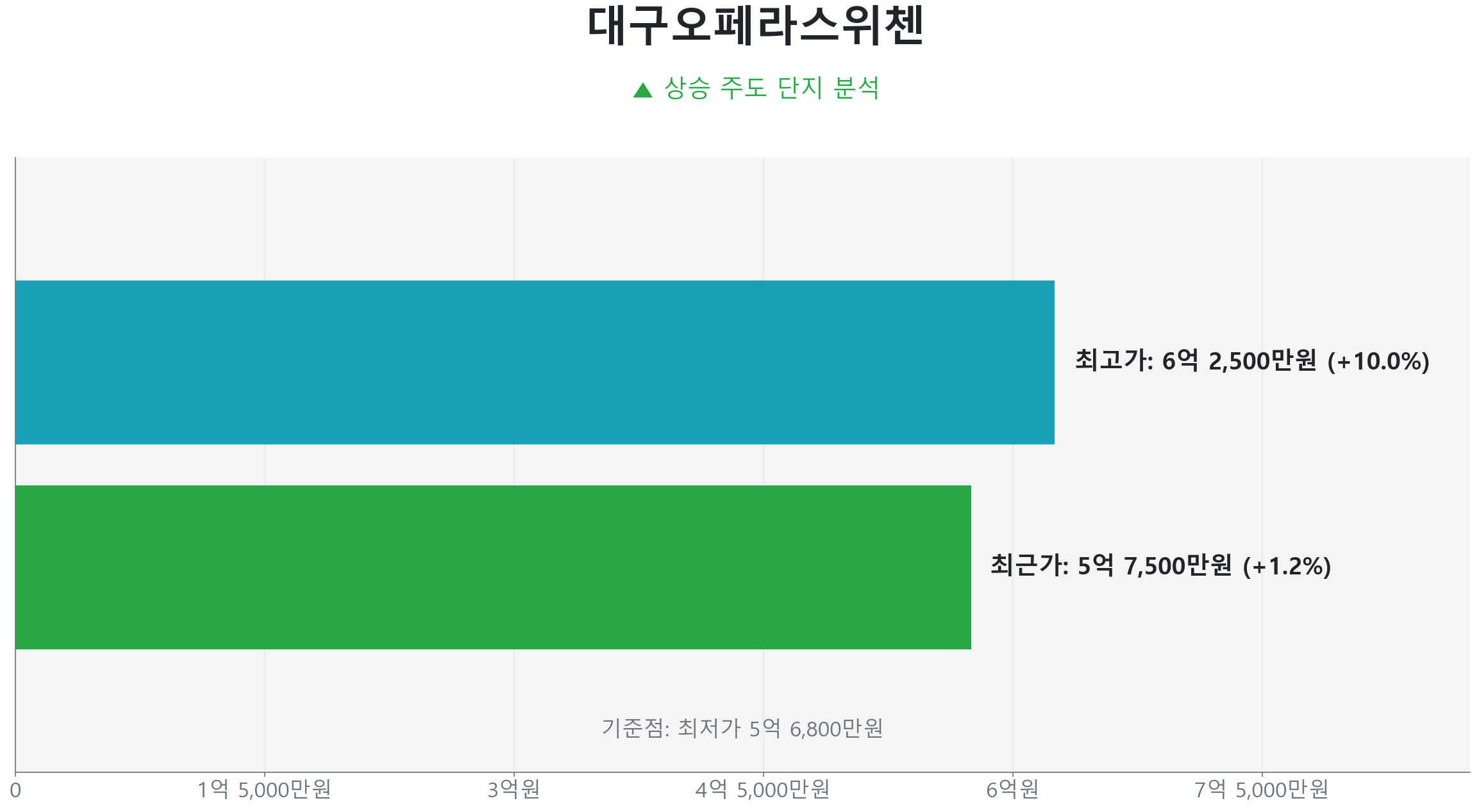 가장 먼저 주목할 곳은 고성동1가 대구오페라스위첸 (84.0㎡ 타입)입니다. 854세대의 중규모 단지이자 준공 1년차 신축 아파트인 이곳은 시장을 주도하는 뚜렷한 상승 흐름을 보이고 있습니다.