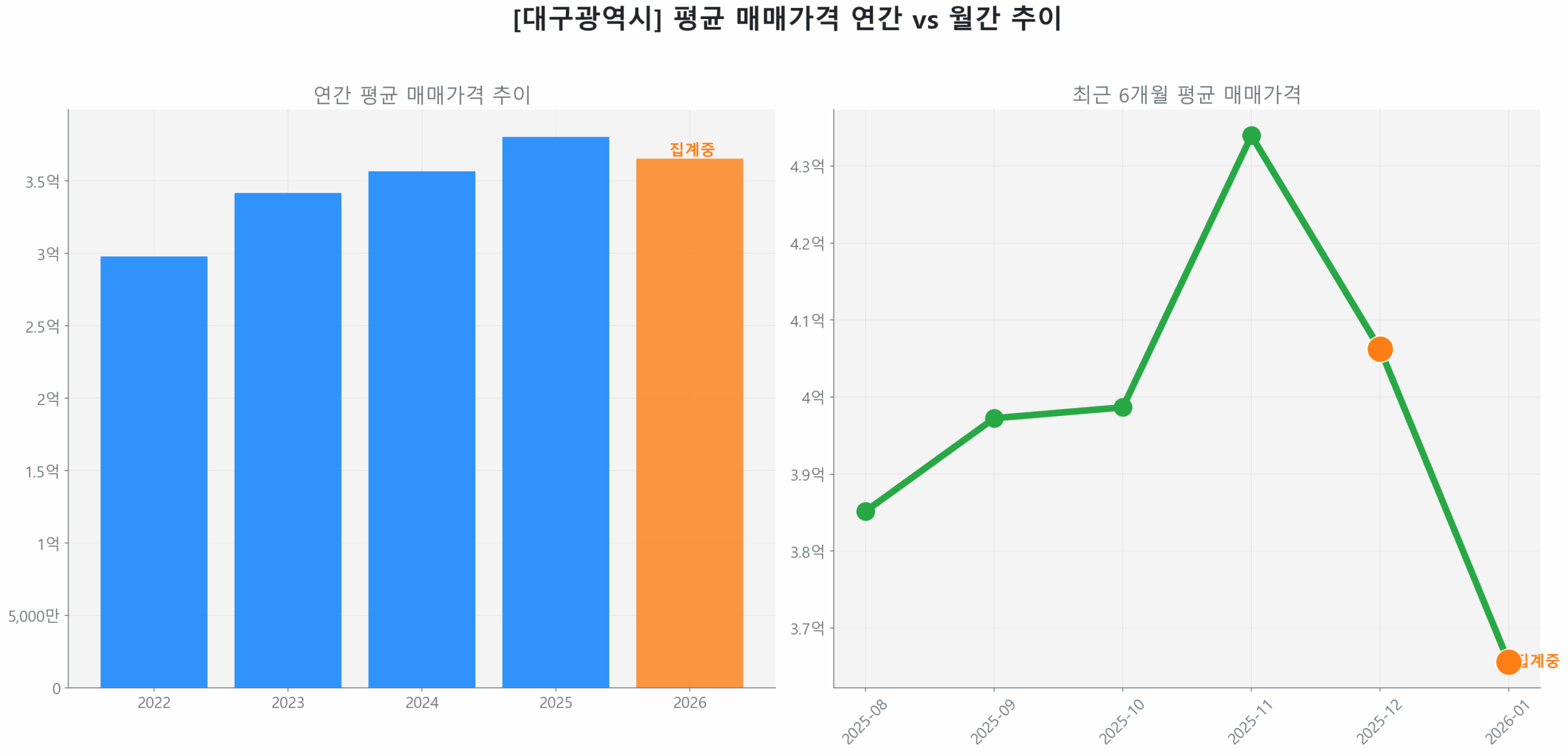 한편, 고성동1가 대구역오페라W (84.0㎡ 타입), 준공 2년차 신축 아파트 역시 93건의 활발한 거래량과 전년 대비 4.7% 상승한 매매가로 시장의 상승세를 견인하고 있으며, 2026년 1월 5억 9,000만 원에 거래되며 빠른 회복력을 과시했습니다.