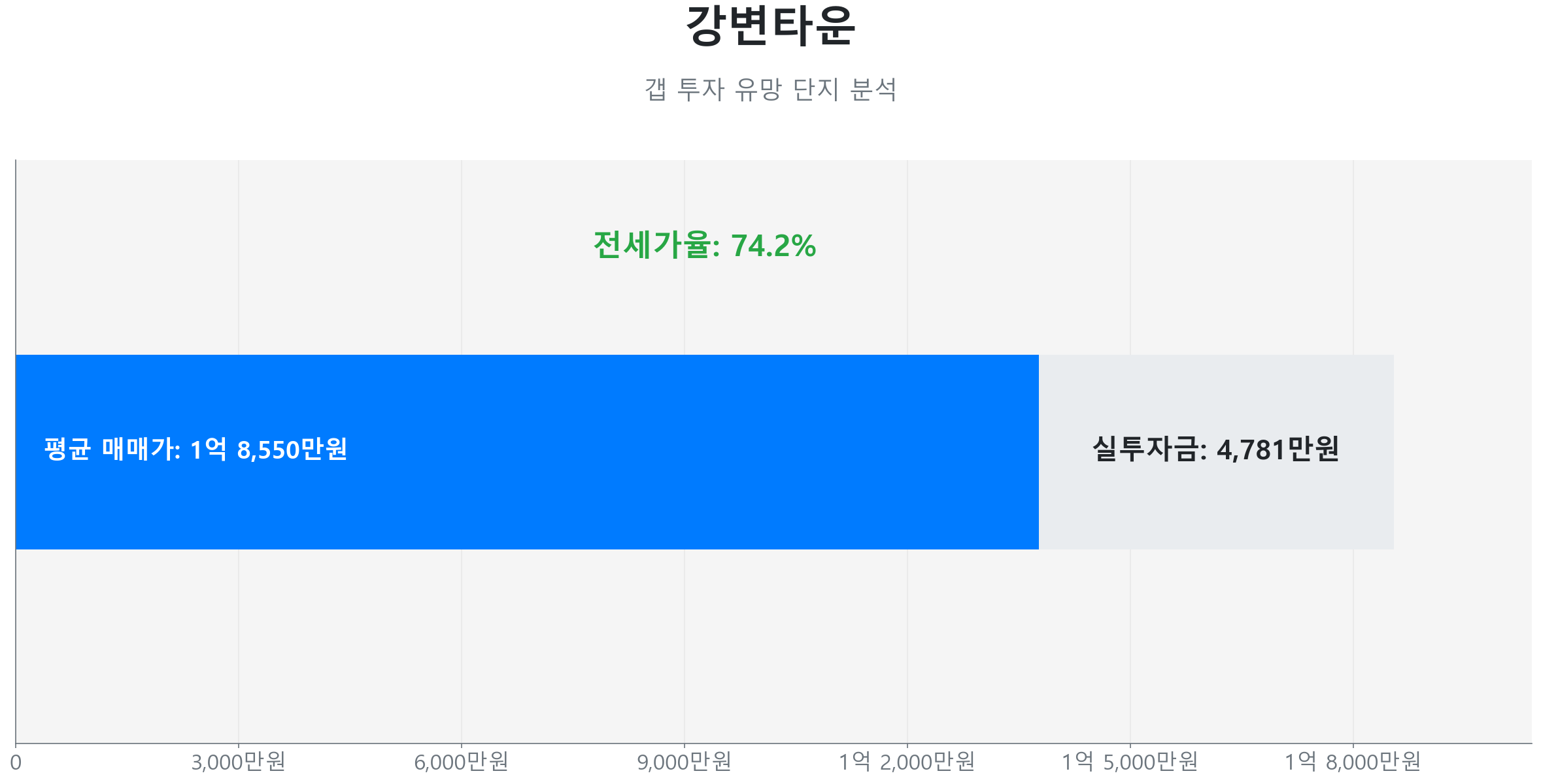 A1. 현금 투자 효율이 높은 이천동 강변타운(59.0㎡)의 경우 전세가율 약 74.2%를 기록하고 있습니다. 현재 기준 실투자금(갭)은 약 4,781만 원 수준으로 형성되어 있으며, 13건의 거래가 발생하며 꾸준한 실거래 활기도를 보여주고 있습니다.