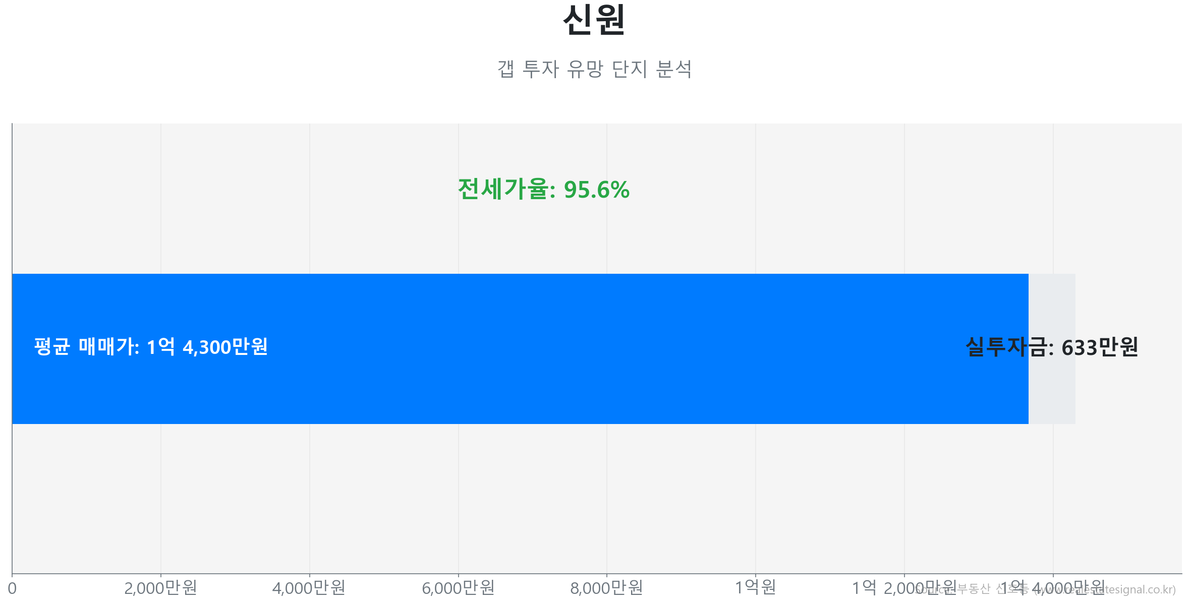 가장 먼저 보실 곳은 신원(59.0㎡)입니다. 2000년 준공된 352세대의 이 단지는 최근 1년 평균 데이터를 기준으로 분석했을 때, 전세가율이 무려 95.6%에 달해 실투자금 약 633만 원이라는 아주 가벼운 금액으로 진입이 가능합니다. 대학가 배후 수요가 탄탄해 전세가 방어가 매우 잘 되는 전형적인 실속형 투자처입니다.