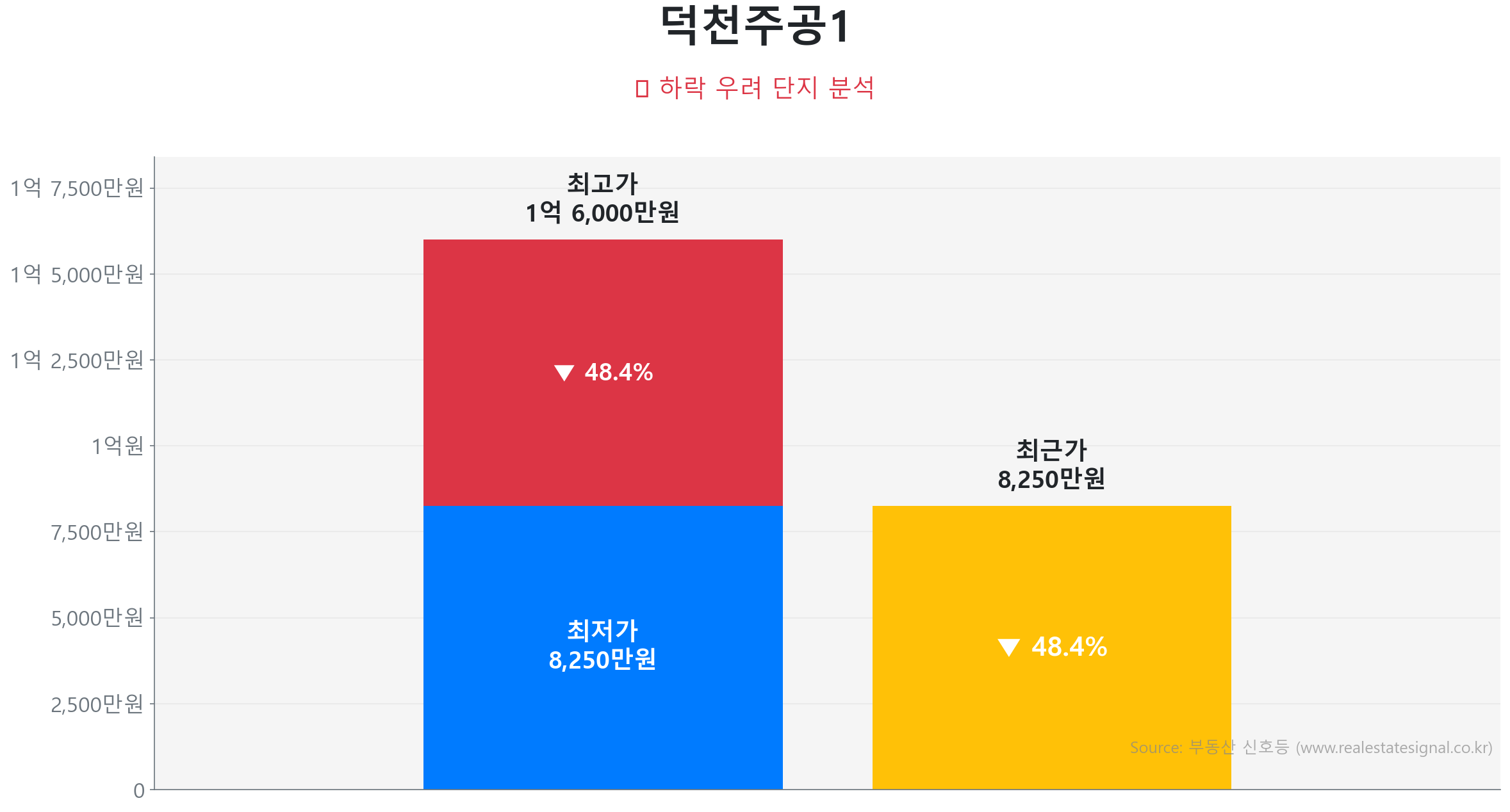부산 덕천동 아파트 시장은 2024년 12월 기록한 역사적 고점(3억 8,929만 원)과 2025년 2월의 저점(1억 9,925만 원) 사이 하락폭의 79.9%를 회복하며 ‘회복(Recovery)’ 국면의 후반부에 진입했습니다.