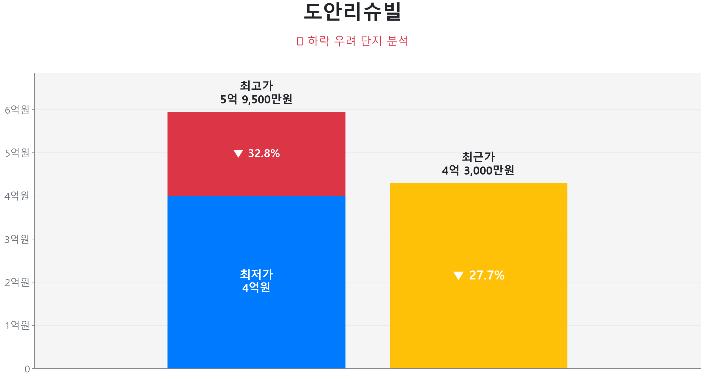 이처럼 도안동의 핵심 입지 단지들이 호재를 바탕으로 상승 흐름을 이어가는 가운데, 일부 단지들은 트램 공사로 인한 교통 체증과 향후 공급 과잉의 그림자 속에서 조정기를 겪고 있습니다. 시장의 양극화가 심화되는 현 상황에서, 다음으로 살펴볼 단지들은 이러한 리스크 요인들이 가격에 어떻게 반영되고 있는지 보여줍니다.