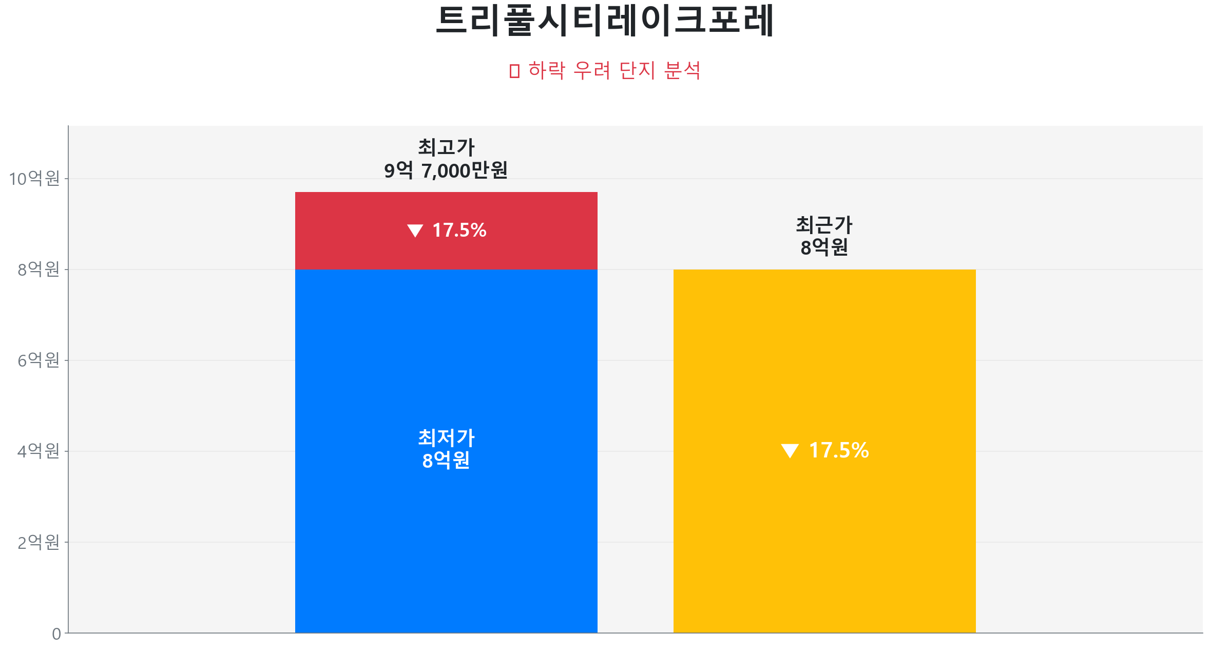 이러한 조정 흐름은 도안동 트리풀시티레이크포레 (97.8㎡ 타입), 1,762세대, 준공 5년차 신축 단지에서도 나타납니다. 호수 조망이라는 강력한 프리미엄을 가졌음에도 불구하고, 2025년 12월 1층 매물이 8억 원에 거래되며 고점 대비 17.53% 하락한 수준을 보였습니다.