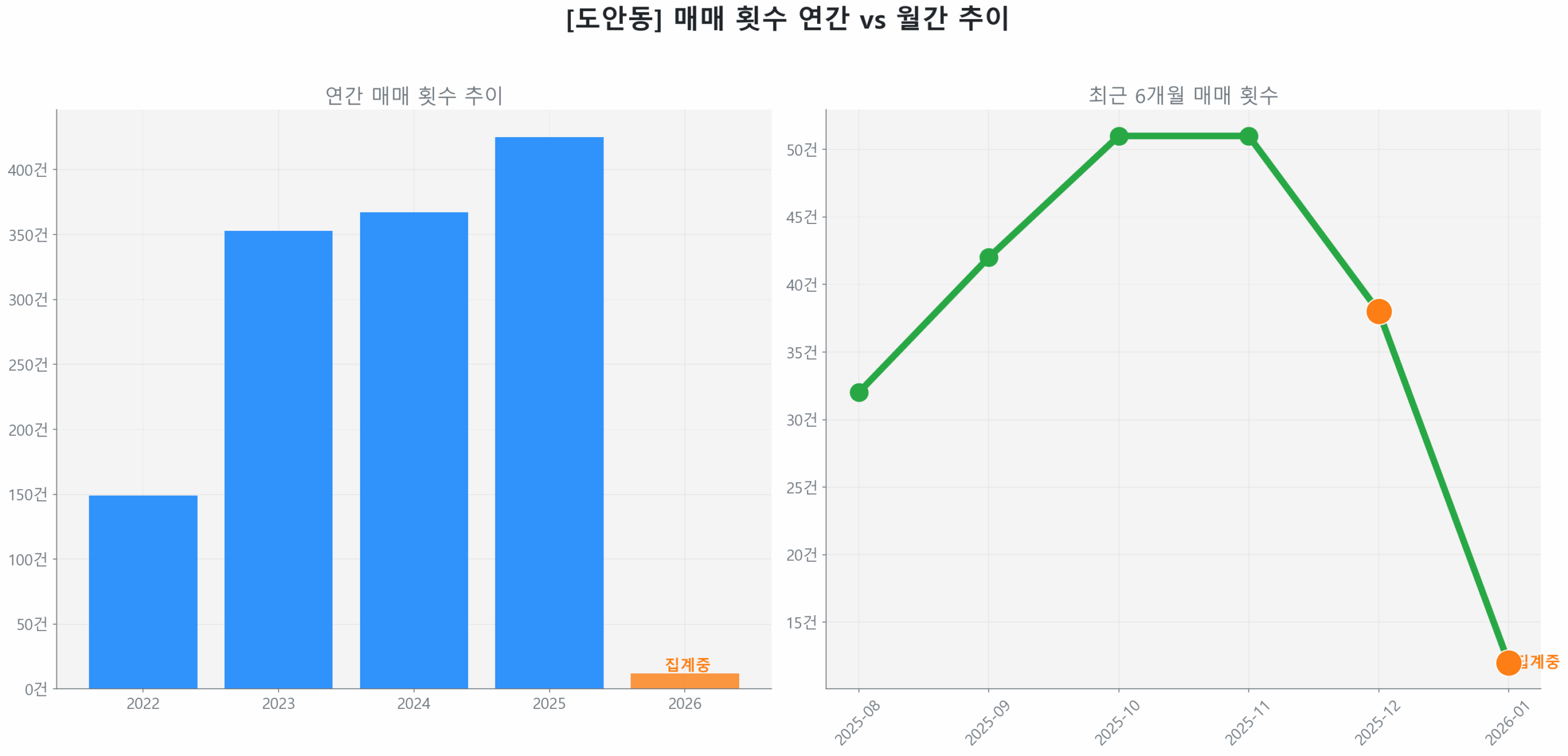 도안동 시장은 최근 3개월간 거래량이 46건으로 전 분기 대비 57.3% 상승세를 보이며 탄력적인 수요 반응을 나타내고 있습니다. 특히 구축 아파트 중심의 안정적인 거래 구조 속에서 전세가율이 0.4%p 좁혀지며 소액 갭투자 환경이 개선되고 있어, 선별적 회복 초기 국면으로 진단됩니다.