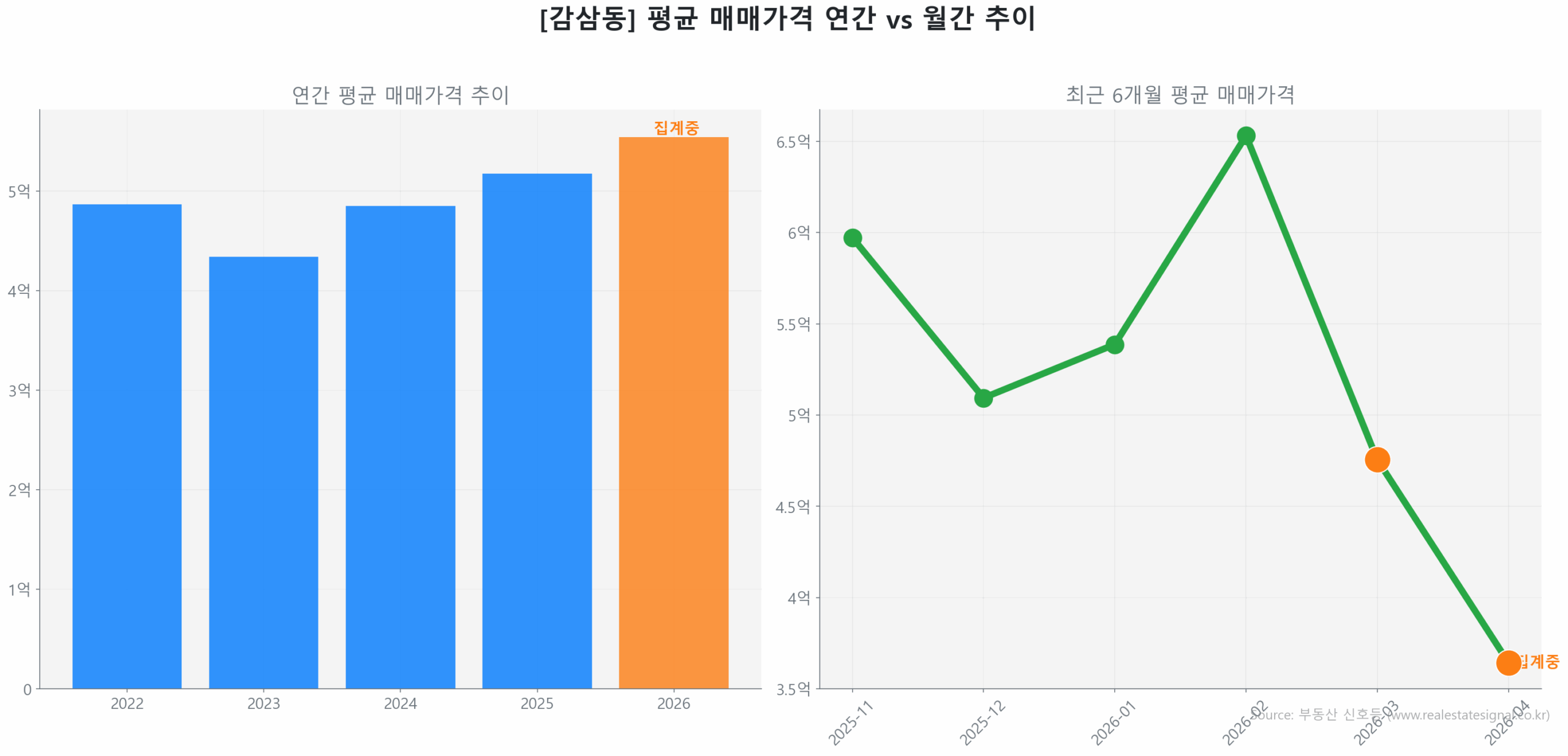 현재 시장의 핵심 동력은 가격 하락을 동반한 거래량의 유의미한 팽창입니다. 최근 3개월간 평균 매매가는 5억 5,576만 원으로 전 분기 대비 7.3% 하락했으나, 거래량은 37건을 기록하며 19.4%의 견조한 상승세를 보였습니다.