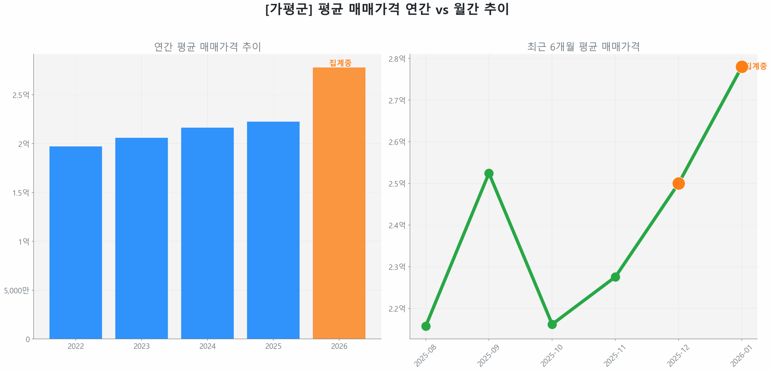 최근 3개월(2025년 10월~12월) 거래량은 17건으로 전 분기 대비 29.3% 급증하며 시장의 활기가 거래량 중심으로 나타나고 있습니다. 반면 같은 기간 평균 가격은 2억 3,112만 원으로 2.2% 하락하며 보합세를 유지, 가격보다는 거래량 증가가 핵심 동력임을 시사합니다. 통계적으로 Z-점수 2.39를 기록하며 강력한 추세 전환 신호가 포착되었으며, 매수자들의 탄력적 수요가 확인되나, 신축 아파트 거래량은 14.6%에 불과하여 구축 아파트 중심의 선별적 회복 양상을 보입니다.