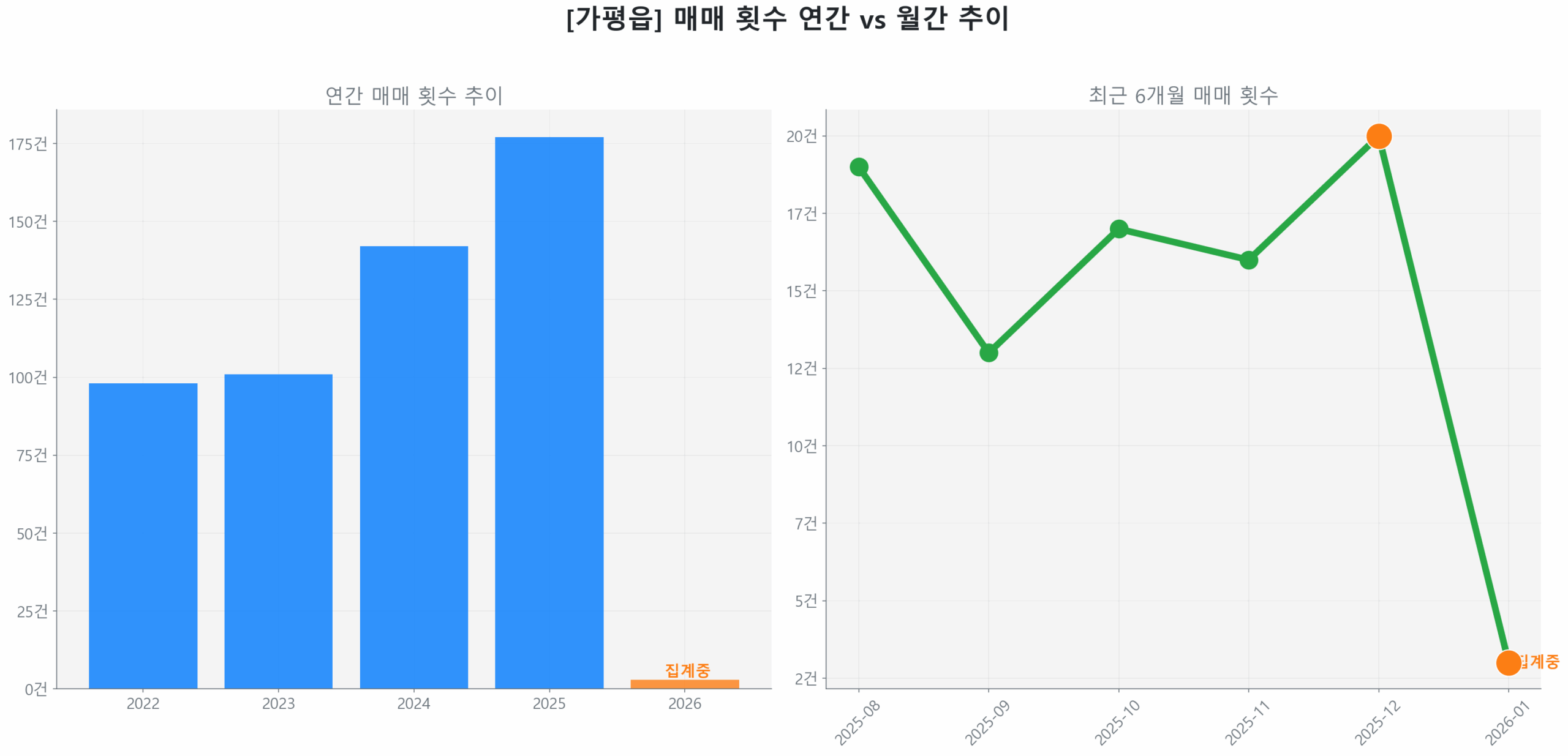 2025년 12월 14일 확정치 기준, 가평읍 부동산 투자 시장은 역사적 저점 대비 50.86% 반등하며 회복 국면에 진입했습니다. 전년 동기 대비 매수 가속도가 17.17%를 기록하며 시장 에너지의 전반적인 가속화가 관측되는 가운데, 현재 가평읍 부동산 투자 시장은 선별적 회복 초기 국면에 진입한 것으로 최종 진단됩니다.