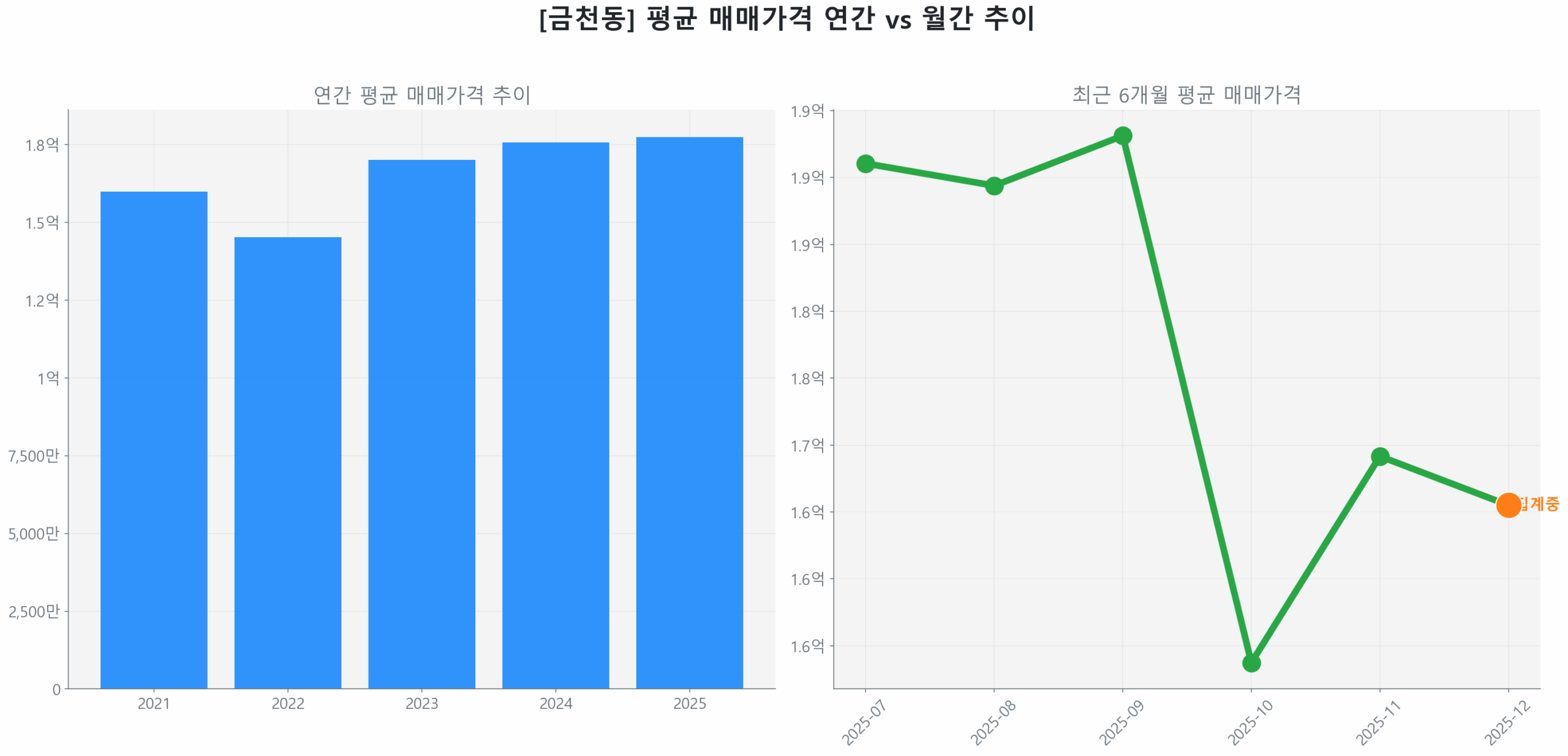 한편, 금천동 장자마을부영(324-3단지) (84.0㎡ 타입), 378세대의 준공 22년차 구축 단지는 숨고르기 장세를 이어가고 있으며, 2025년 12월 8층 매물이 2억 1,900만 원에 거래되었습니다.