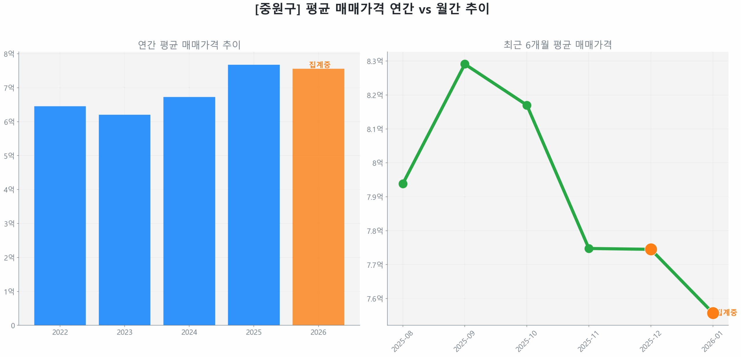 최근 3개월간 거래량은 41건으로 전 분기 대비 22.8% 하락했음에도 불구하고, 평균 가격은 8억 2,759만 원으로 7.2% 상승하는 불균형적인 흐름이 관측됩니다. 이는 가격 수용 지수 1.87이 보여주듯 매수자들이 가격 상승을 감수하며 적극적으로 매수하는 경향이 강하며, 시장 에너지가 특정 신축 단지가 아닌 구축 아파트(72.8%) 중심의 넓은 실거주 수요에 의해 지지되고 있음을 시사합니다.