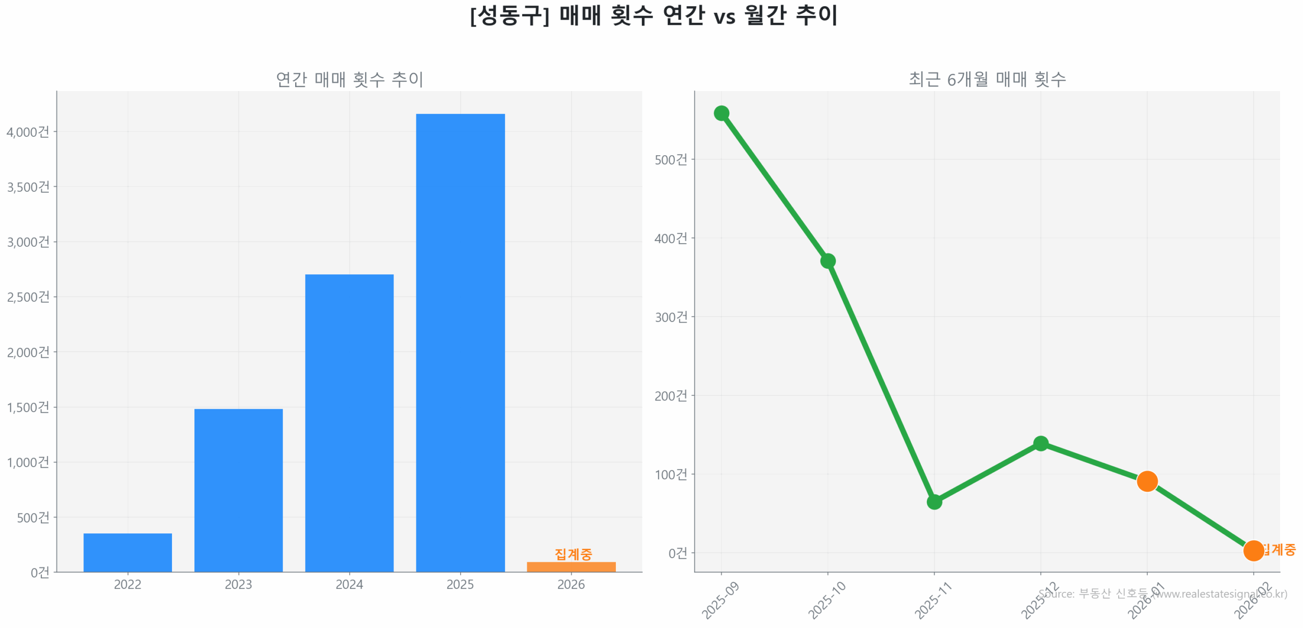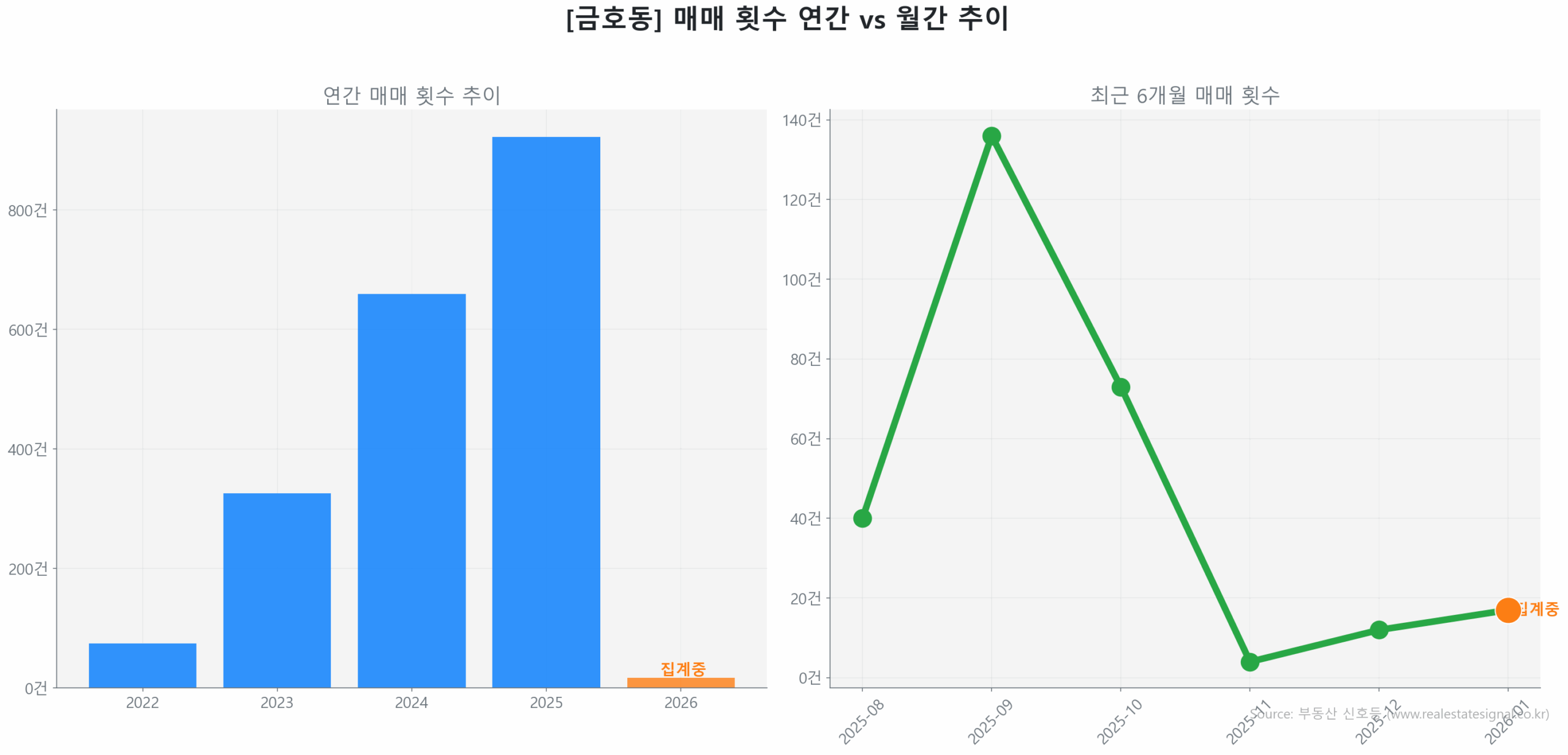 • 금호동 시장은 거래량이 66.3% 급감했으나 가격은 9.4% 상승하며 바닥 다지기 국면에 들어섰습니다.