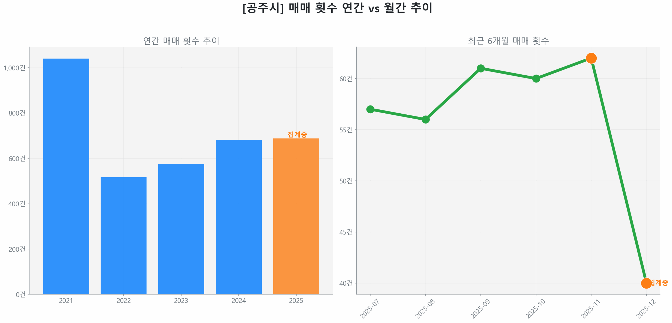 2025년 12월 기준 공주 아파트 시장은 거래량이 56.4% 급증하며 초기 회복 국면에 진입했습니다. 특히 전세가율 87%에 달하는 신관동 새뜸현대3차 등 소액 갭투자 환경이 급격히 개선되고 있습니다. 제2금강교와 송선 동현지구 등 핵심 호재가 반영된 최신 분석 리포트를 지금 바로 확인하세요.