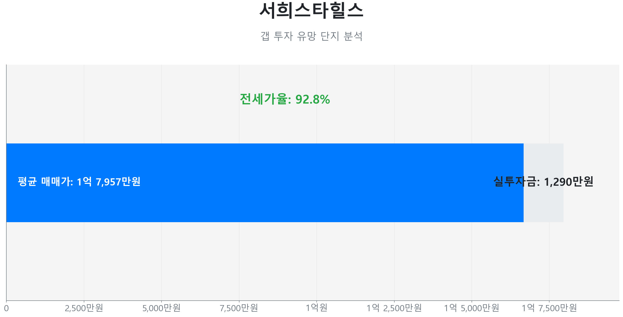 가장 먼저 보실 곳은 지곡동 서희스타힐스입니다. 준공 10년 차 준신축 단지로, 최근 1년의 평균 데이터를 분석했을 때 전세가율이 92.8%에 달해 실투자금 약 1,290만 원으로 진입 가능한 최고의 가성비를 보여줍니다. 이차전지 기업들이 입주하는 새만금 국가산단과의 직주근접성이 뛰어나 배후 수요가 탄탄하며, 전세 수요가 매매가를 밀어 올리는 강한 하방 경직성을 보유하고 있습니다.
