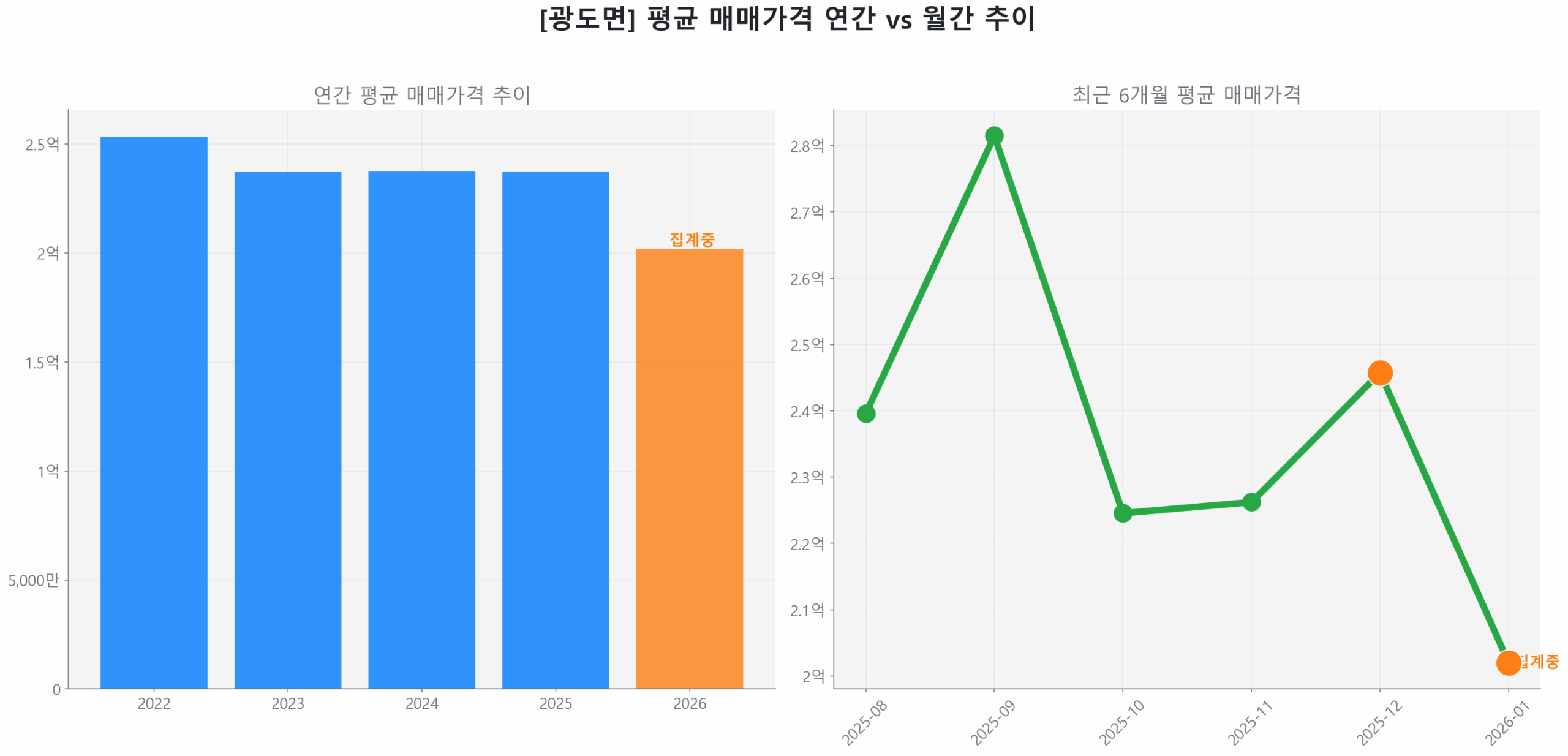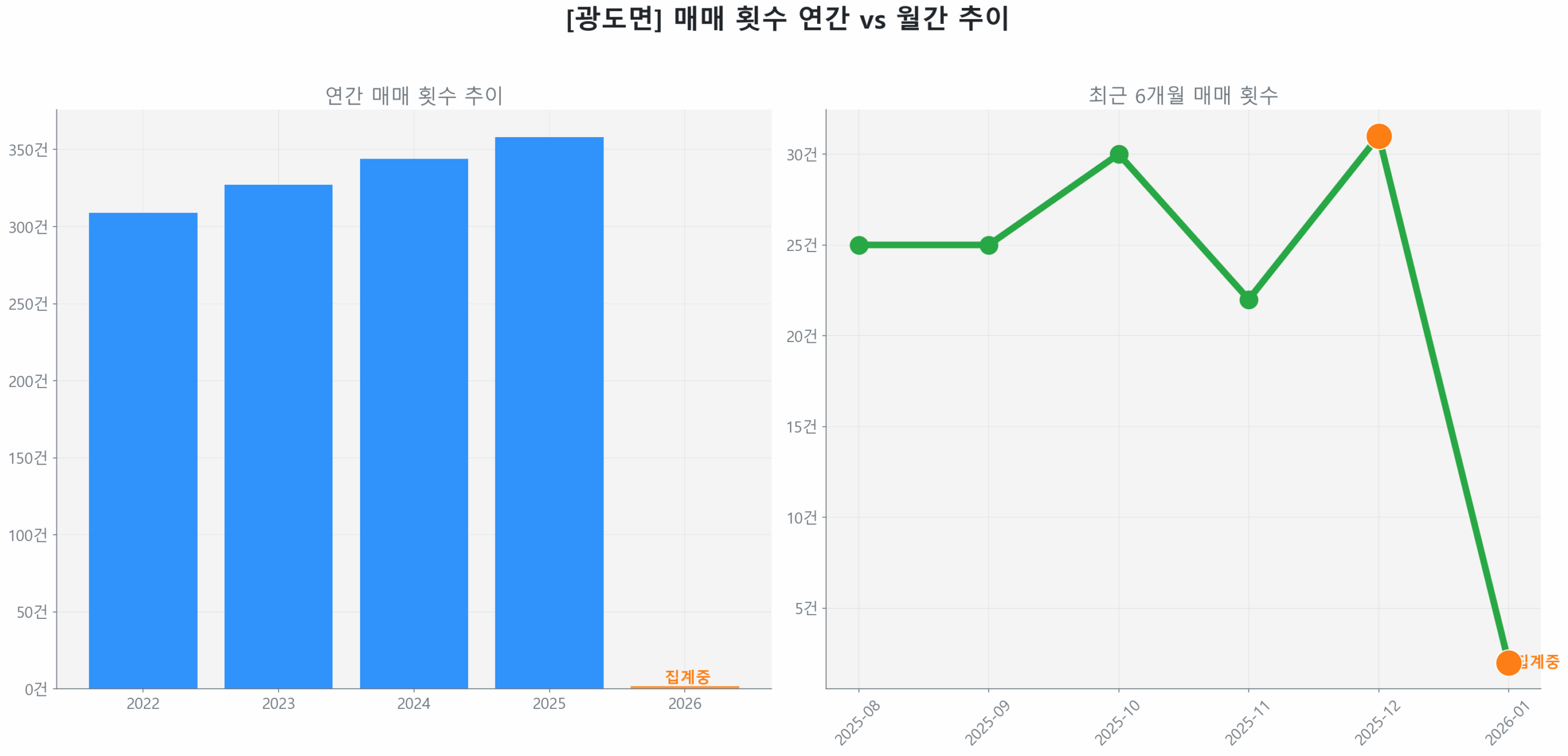 광도면 시장은 최근 3개월간 거래량이 상승세를 보이고 있으나, 가격은 보합세를 유지하며 관망세가 짙은 비탄력적 수요 반응을 나타내고 있습니다. 특히 구축 아파트 중심의 안정적인 거래 구조 속에서 전세가율이 벌어지는 트렌드가 관찰되며, 실수요 기반이 강화되는 선별적 회복 초기 국면으로 진단됩니다.