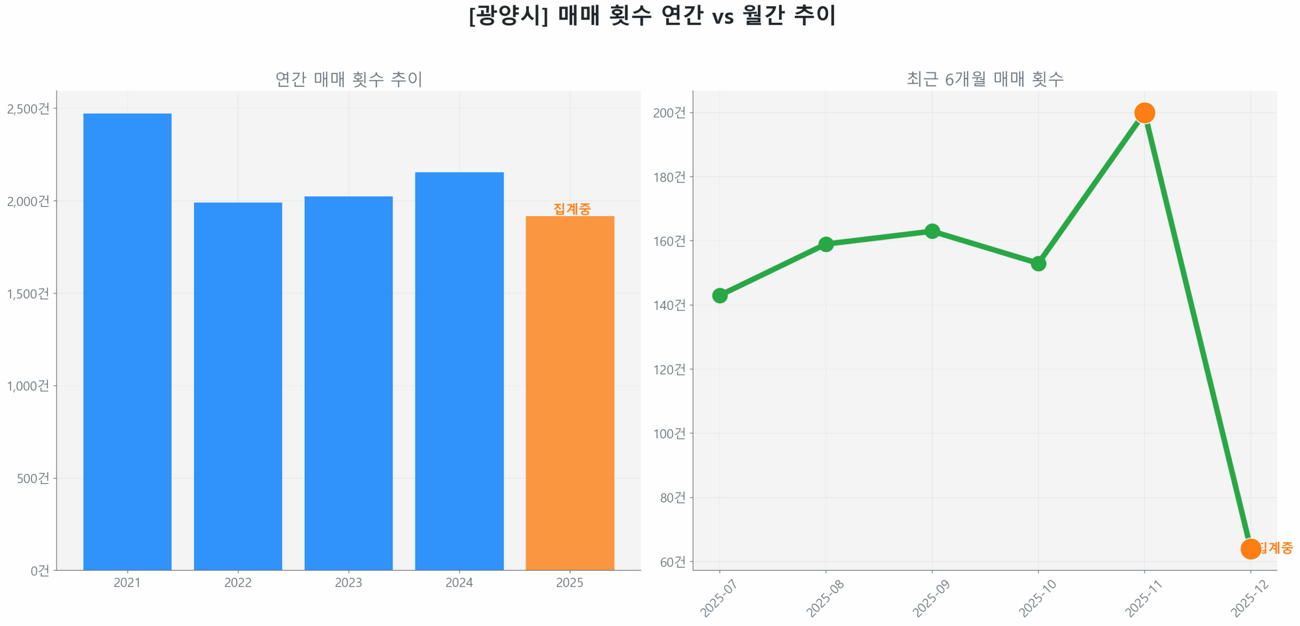 A2. 국토부 실거래 자료 및 월간 거래 데이터를 종합해보면, 규제 발표 직후인 최근 3개월간 월평균 거래량이 약 26% 증가하는 추세를 보였습니다. 특히 11월 거래량이 200건을 돌파하며 비규제 지역으로 유동성이 유입되는 풍선효과가 데이터로 확인되고 있습니다.