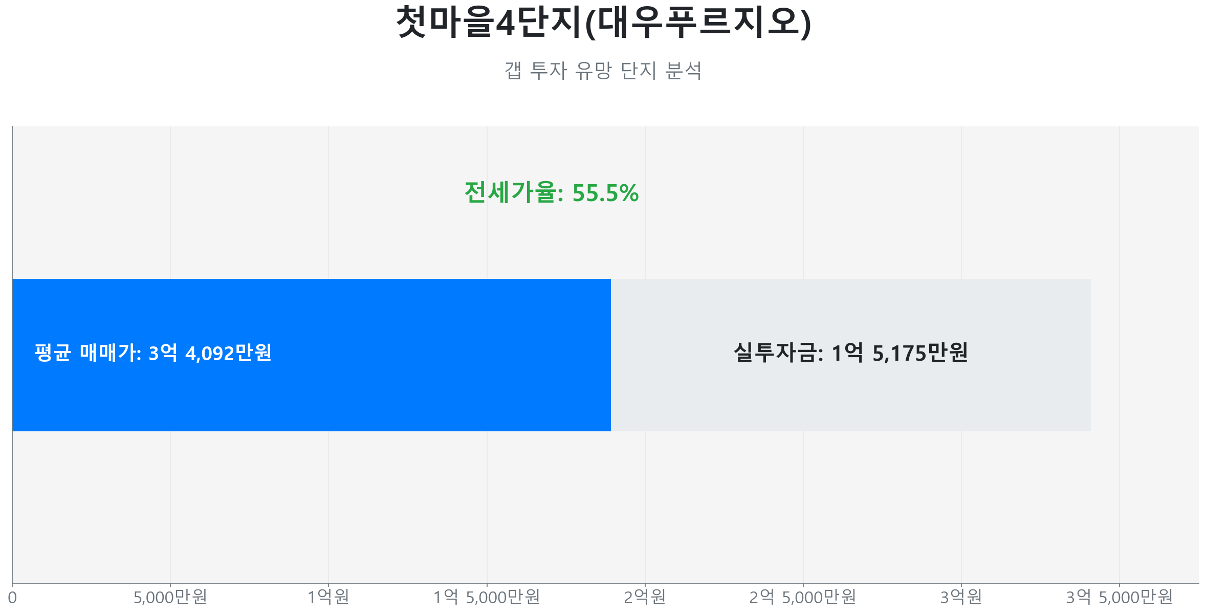 이어서 한솔동 첫마을4단지(대우푸르지오) 59.0㎡ 타입, 2012년 준공 단지는 전세가율 55.49%, 약 1억 5,175만 원의 실투자금으로 투자가 가능하며, ‘초품아’ 단지로서 소형 평형의 낮은 진입 장벽이 투자 포인트입니다.