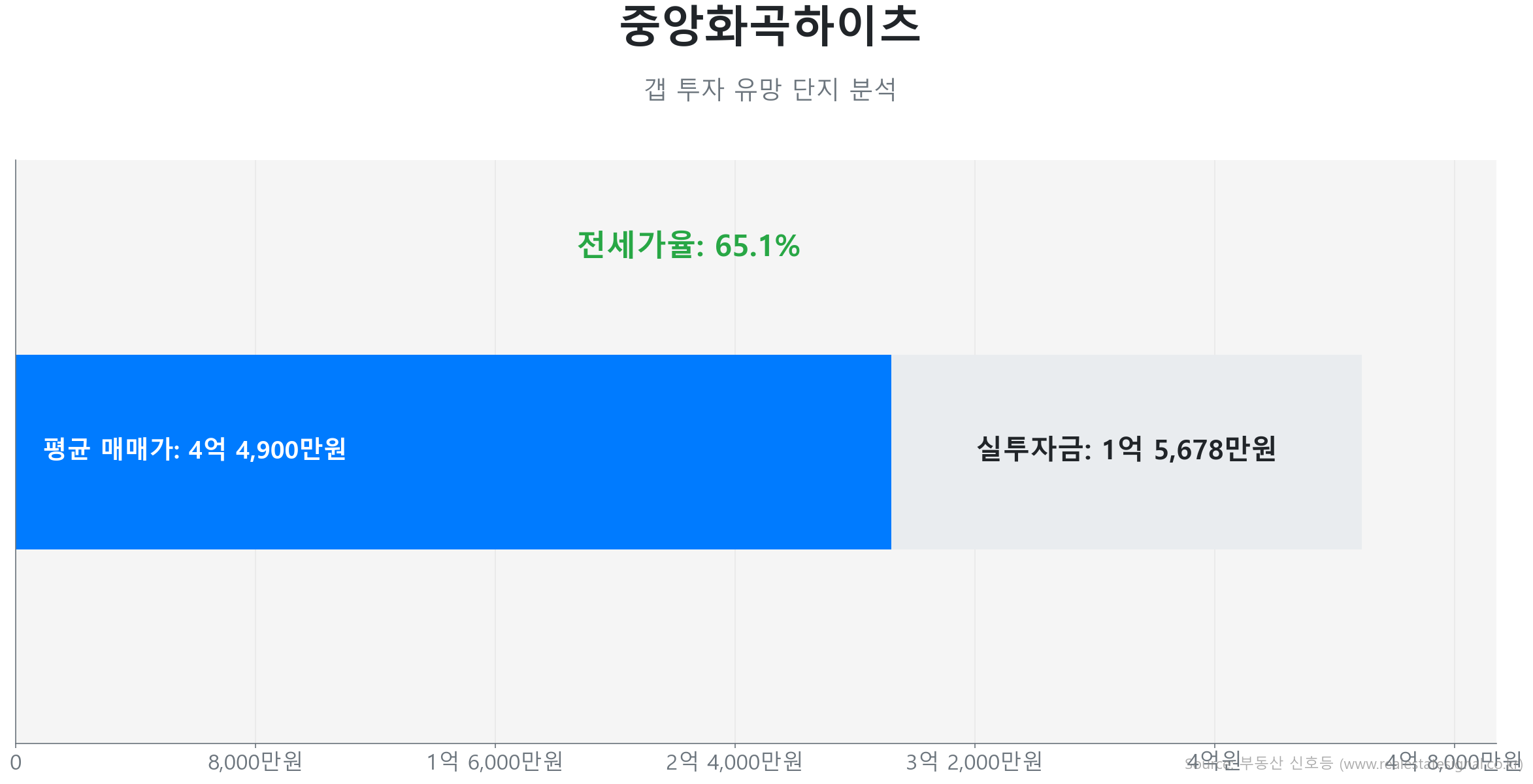 중앙화곡하이츠 56.9㎡의 갭투자 분석. 전세가율은 65.1%이며 예상 실투자금은 1억 5,678만원.