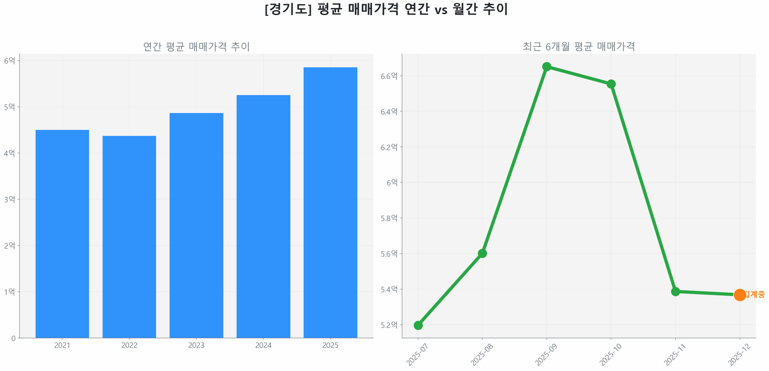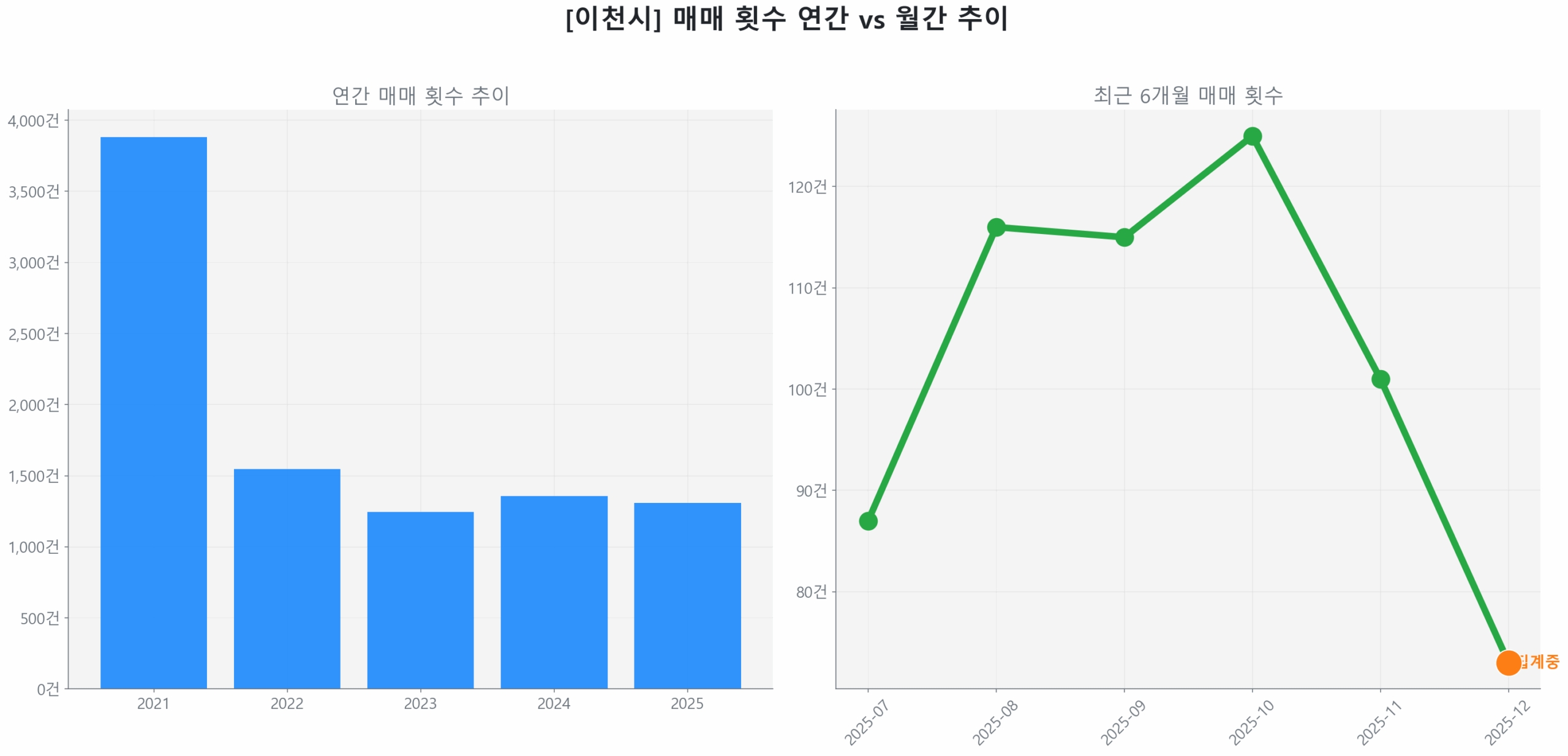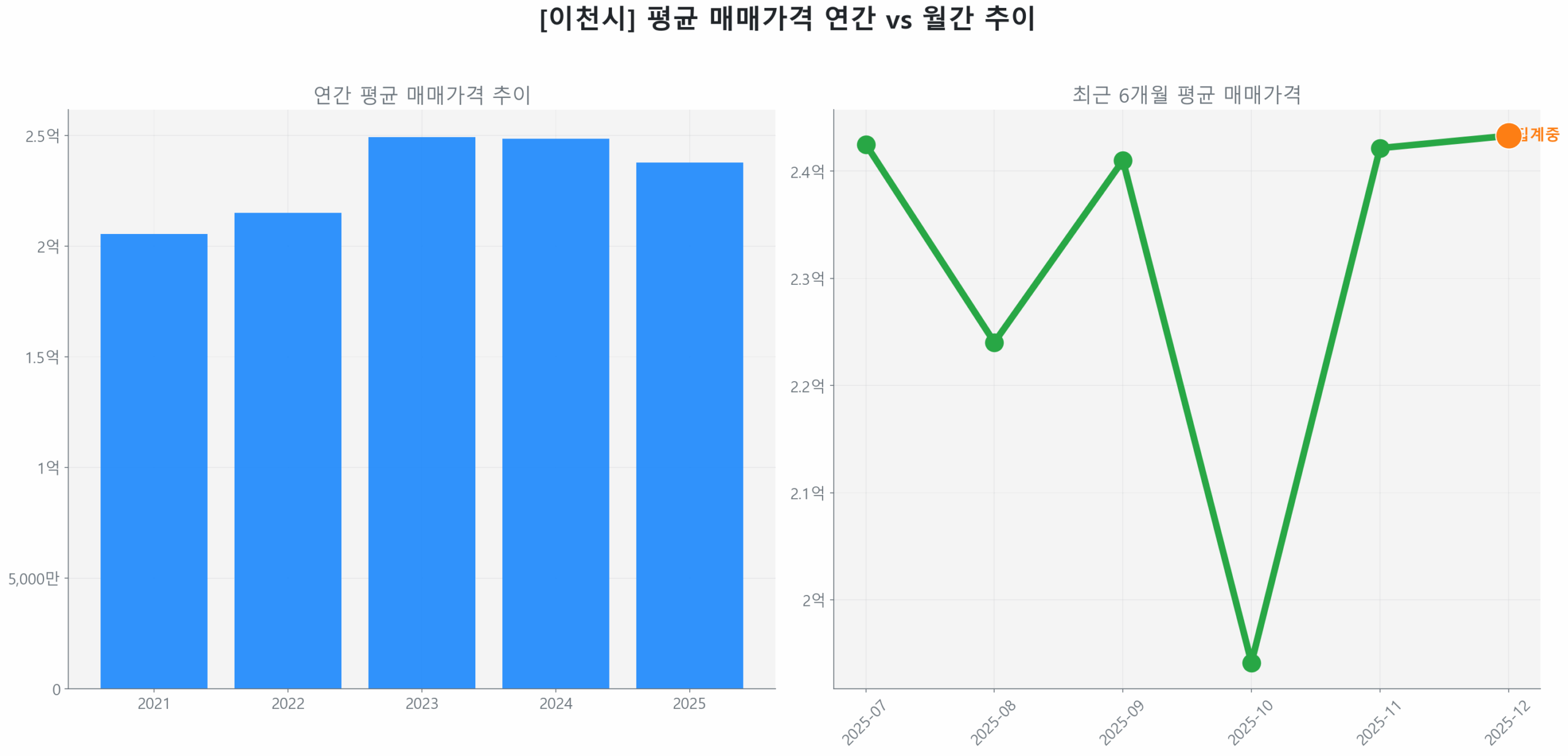 2025년 12월 4일 확정치 기준으로 이천시 시장은 역사적 저점 대비 61.75% 반등하며 회복 국면에 진입했습니다. 2023년 9월 최고점(2억 7,376만 원)과 2025년 10월 최저점(1억 9,416만 원) 사이 하락폭의 61.75%를 회복하며 ‘회복(Recovery)’ 국면에 진입했으나, 아직 역사적 고점 대비 완전히 회복된 것은 아니며 추가 상승 여력이 존재합니다.