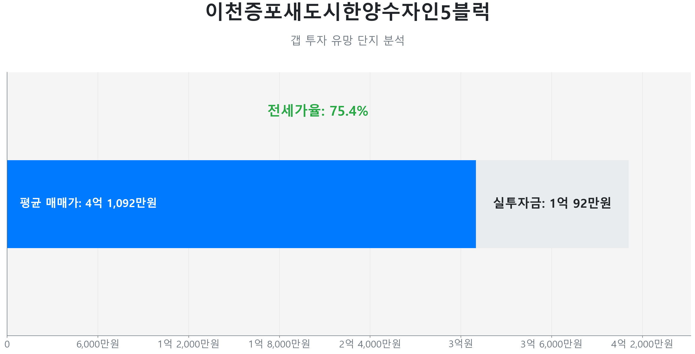 증포동 이천증포새도시한양수자인5블럭 (84.0㎡ 타입)은 준공 9년차 준신축 단지입니다. 역시 최근 1년 평균 전세가율 약 75.4%로, 매매가 전액인 약 4억 1,092만 원을 현금으로 준비해야 합니다. (전세가율 75.4%)