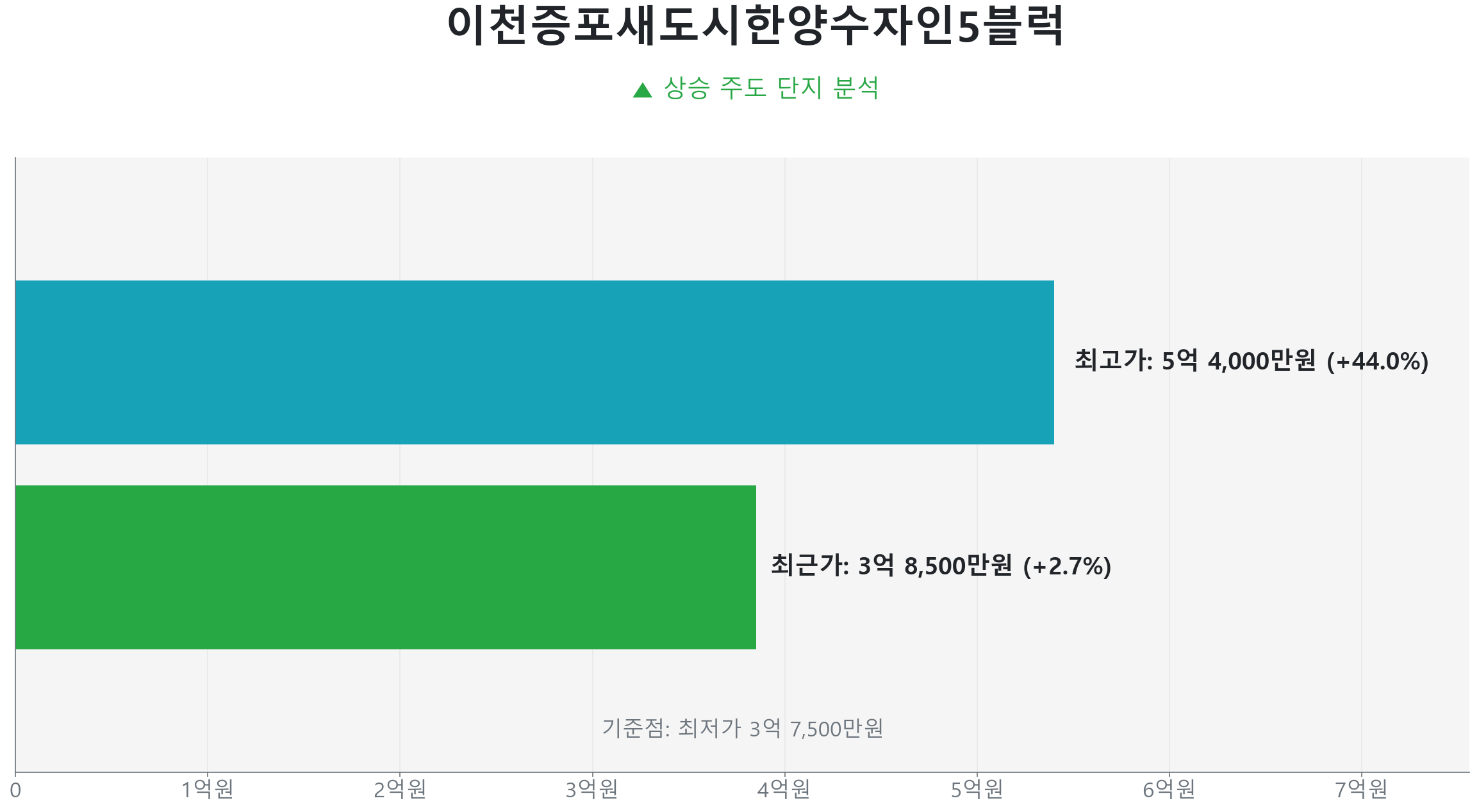 이러한 흐름은 증포동 이천증포새도시한양수자인5블럭 (84.0㎡ 타입), 준공 8년차 준신축 단지에서도 확인됩니다. 중리택지지구 입주 물량 압박 속에서도 75.4%의 높은 전세가율로 가격을 지지하며 보합 장세를 이어가고 있으며, 최근 3억 8,500만 원에 거래되며 2024년 11월 최저점 대비 2.67% 소폭 반등했습니다.