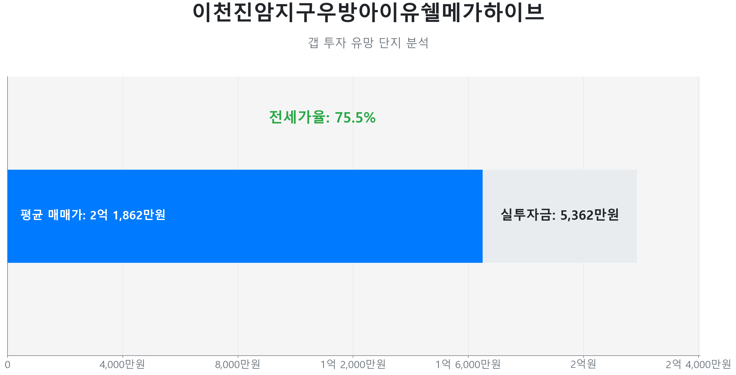 장호원읍 이천진암지구우방아이유쉘메가하이브 (59.0㎡ 타입)는 준공 3년차 신축 단지입니다. 최근 1년 평균 전세가율 약 75.5%를 기록했으며, 실거주 목적이 아니라면 매매가 전액인 약 2억 1,862만 원을 현금으로 접근해야 하는 구간입니다. (전세가율 75.5%)