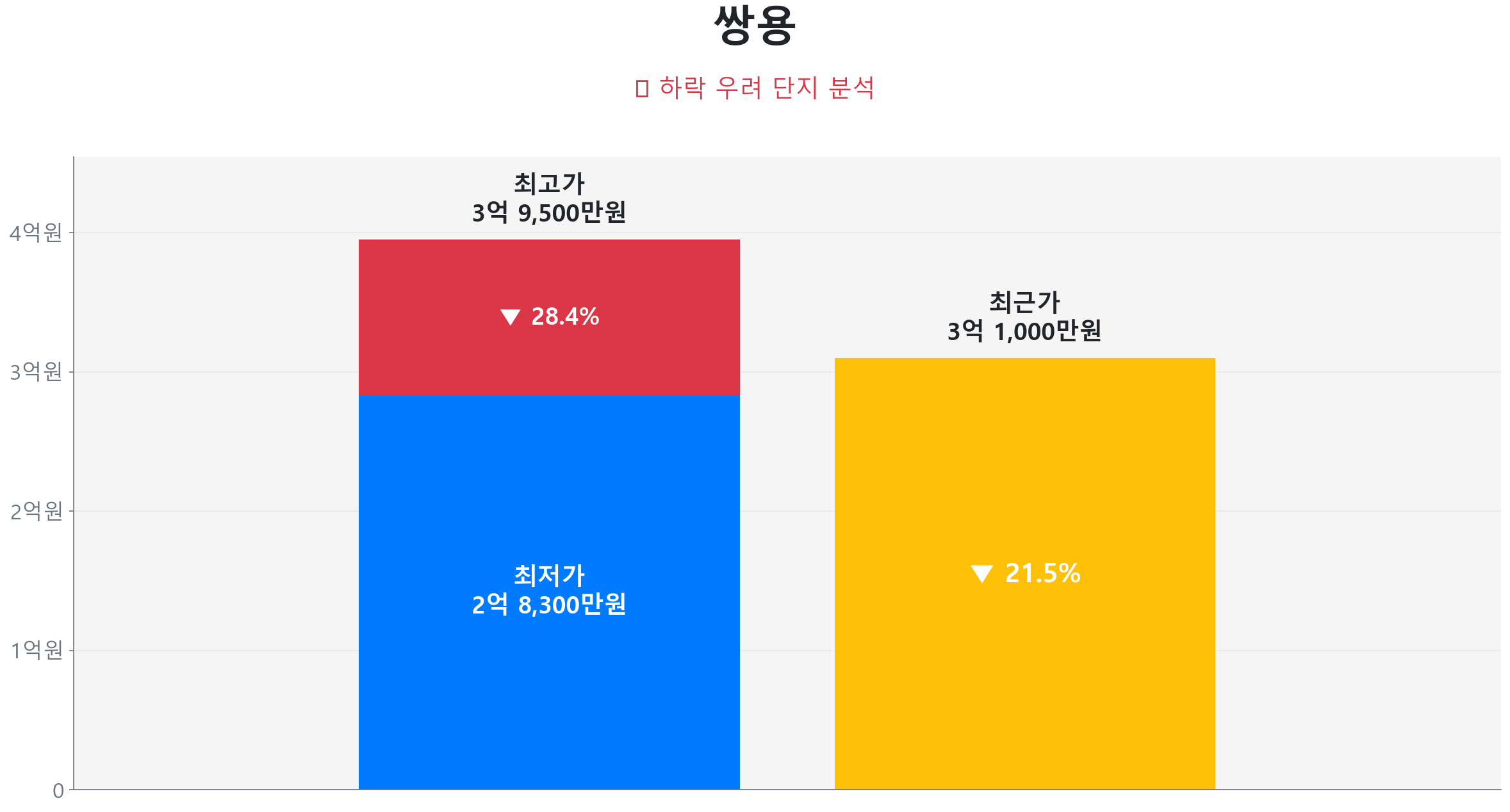 실제로 최근 2026년 1월에 4층 매물이 3억 1,000만 원에 거래되었습니다. 이는 2022년 4월에 기록된 역사적 고점 3억 9,500만 원 대비 21.52% 하락한 수준입니다. 참고로 2025년 8월에는 2억 8,300만 원까지 하락하며 바닥을 찍었으나, 최근 거래가는 당시 대비 9.54% 반등한 모습입니다. 결국 학군이라는 강력한 방어막을 가졌음에도 불구하고, 시장의 전반적인 유동성 감소와 신축 공급의 압박은 가격 조정의 현실을 피할 수 없게 만듭니다.