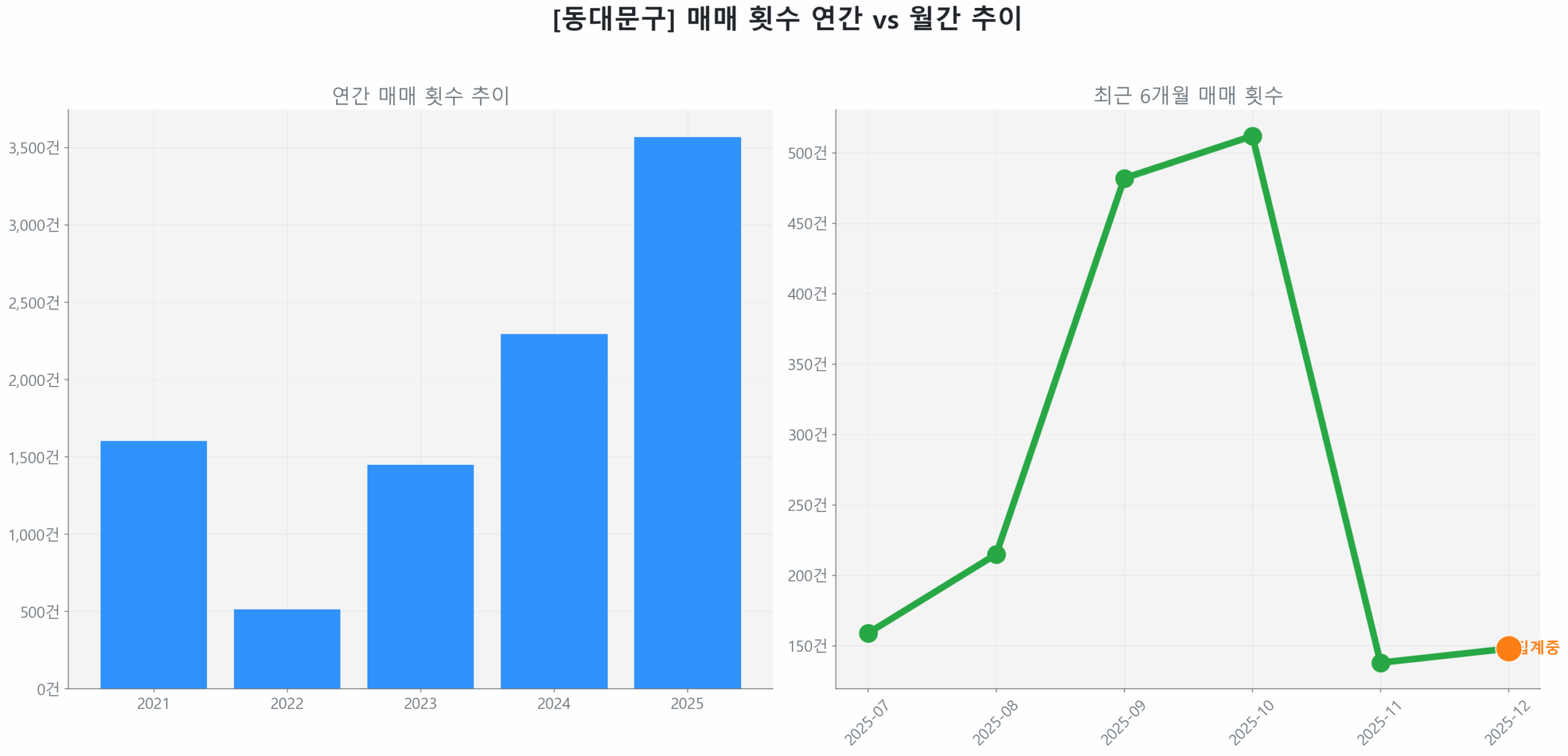 시장의 에너지는 거래량과 가격의 동반 상승으로 증명됩니다. 최근 3개월 확정 거래량은 직전 3개월 대비 65.1% 급증했으며, 같은 기간 평균 거래가 역시 13.7% 상승했습니다.