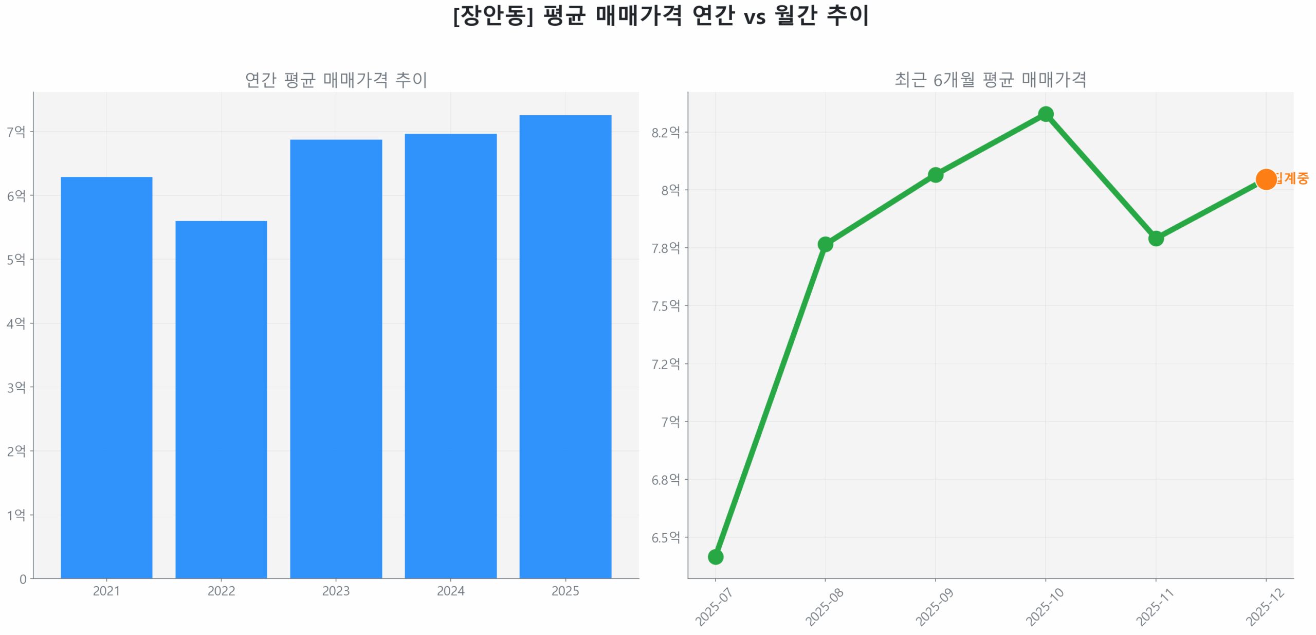 데이터 분석 결과, 장안동 아파트 시세는 2022년 12월 고점과 2025년 4월 저점 사이의 하락폭을 83.87% 회복하며 성숙한 회복 단계에 진입했습니다.