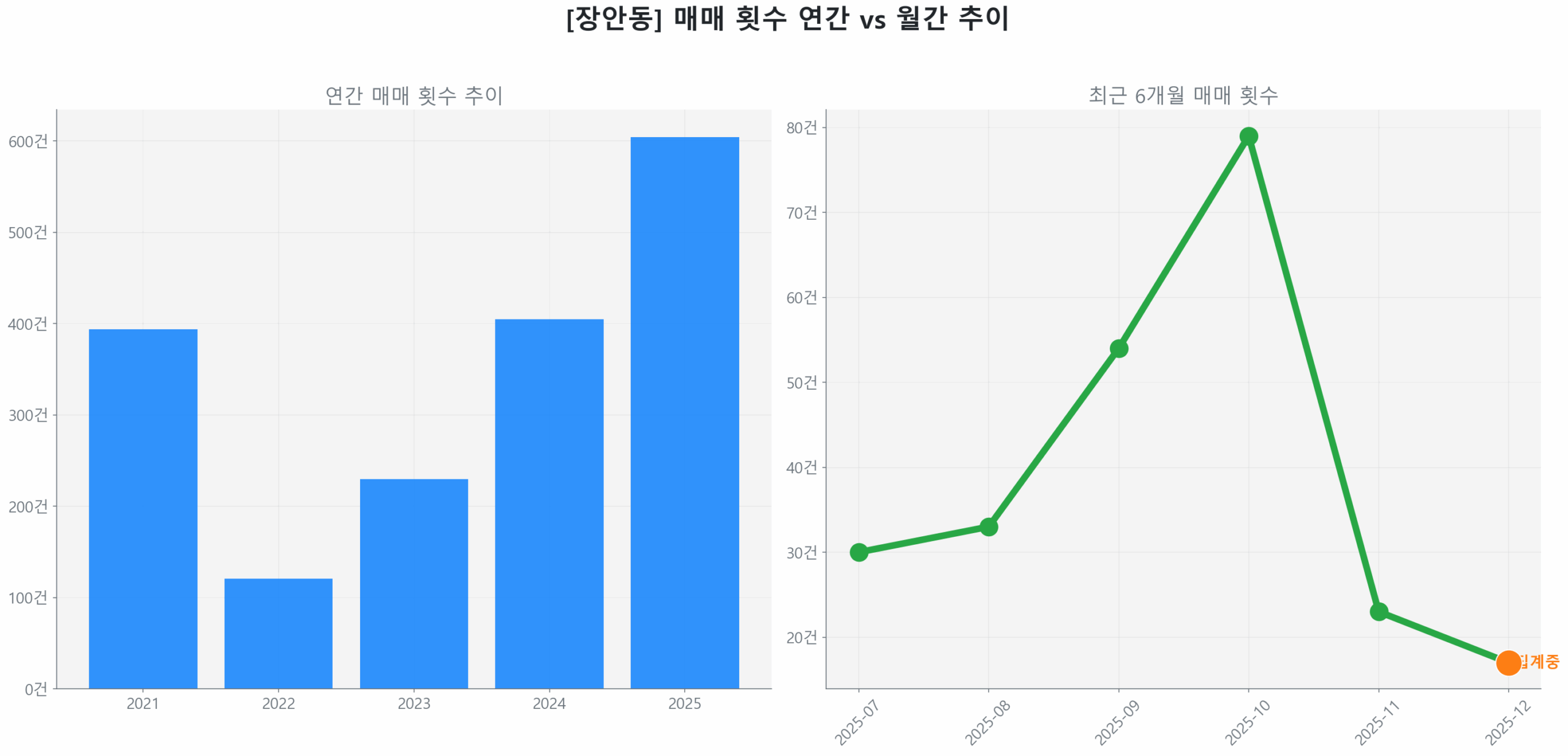 • 장안동 시장은 저점 대비 83.87% 회복했으나, 토지거래허가구역 규제로 단지별 양극화가 극심합니다.
