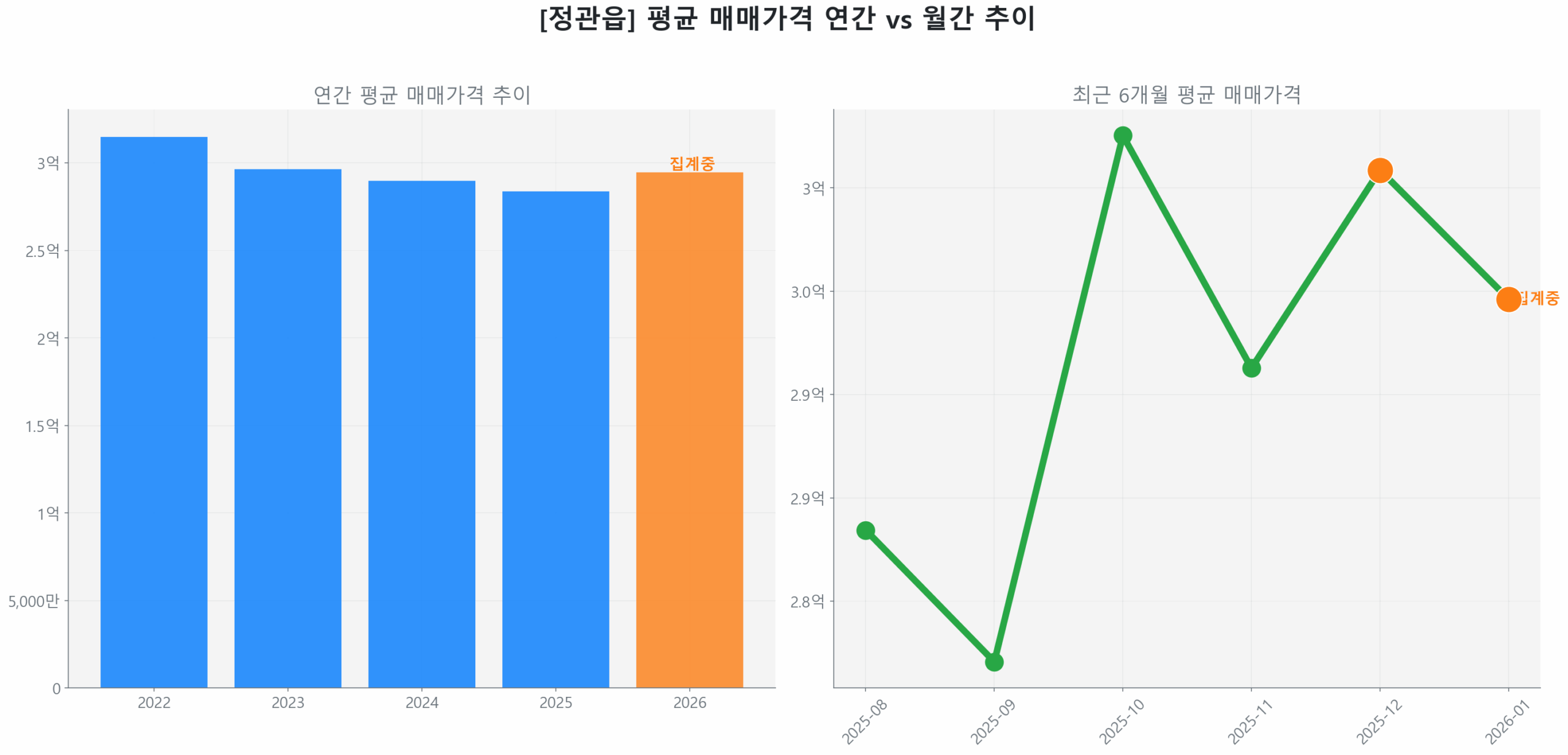 최근 3개월(2025년 10월 ~ 2025년 12월)간 정관읍 부동산 투자 시장의 거래량은 74건으로 전 분기 대비 39.6% 급등했으며, 같은 기간 평균 가격은 2억 9,822만 원을 기록하며 6.4% 상승했습니다.