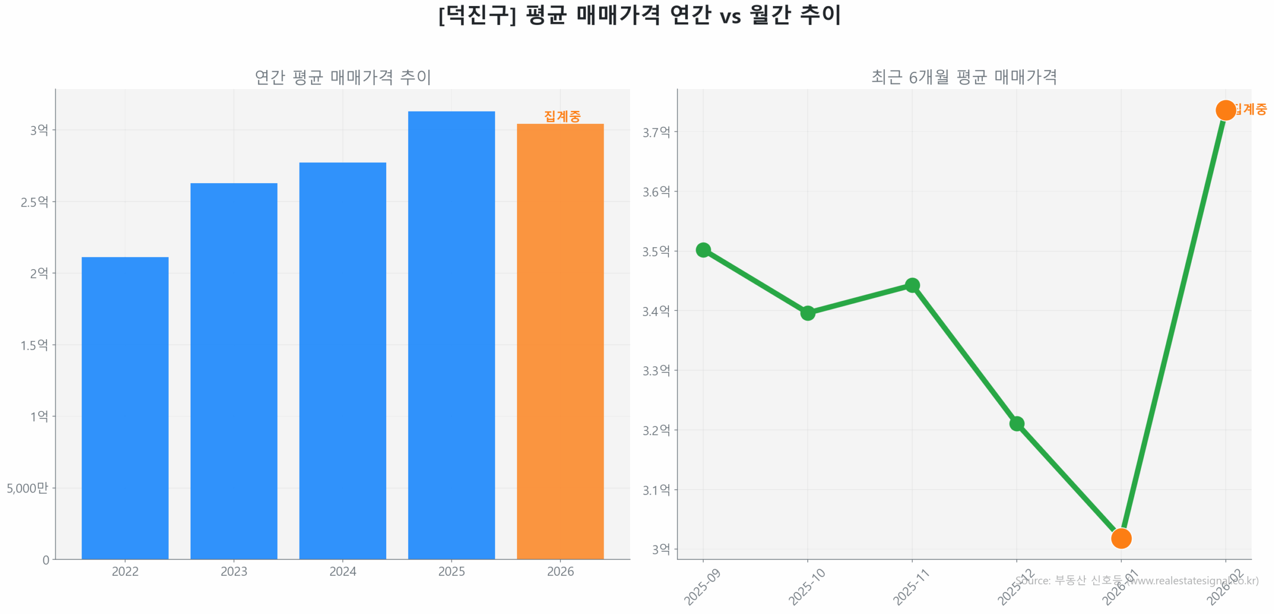 2026 전주 인후동 부동산 전망을 가늠할 수 있는 거시 지표들은 명확한 방향을 가리키고 있습니다. 인후동 시장은 2026년 2월 4일 분석 기준, 역사적 저점 대비 80.4%의 회복률을 달성하며 명확한 ‘Recovery(회복)’ 국면에 진입했습니다. 2025년 10월 기록한 직전 고점(2억 2,584만 원) 회복을 위해 점진적으로 북상 중인 현재 시장은, Z-Score가 -0.91로 통계적 노이즈 범위 내에 머물러 있어 폭발적인 추세 전환보다는 안정적인 에너지가 응축된 ‘선별적 회복 초기 국면’으로 정의됩니다.