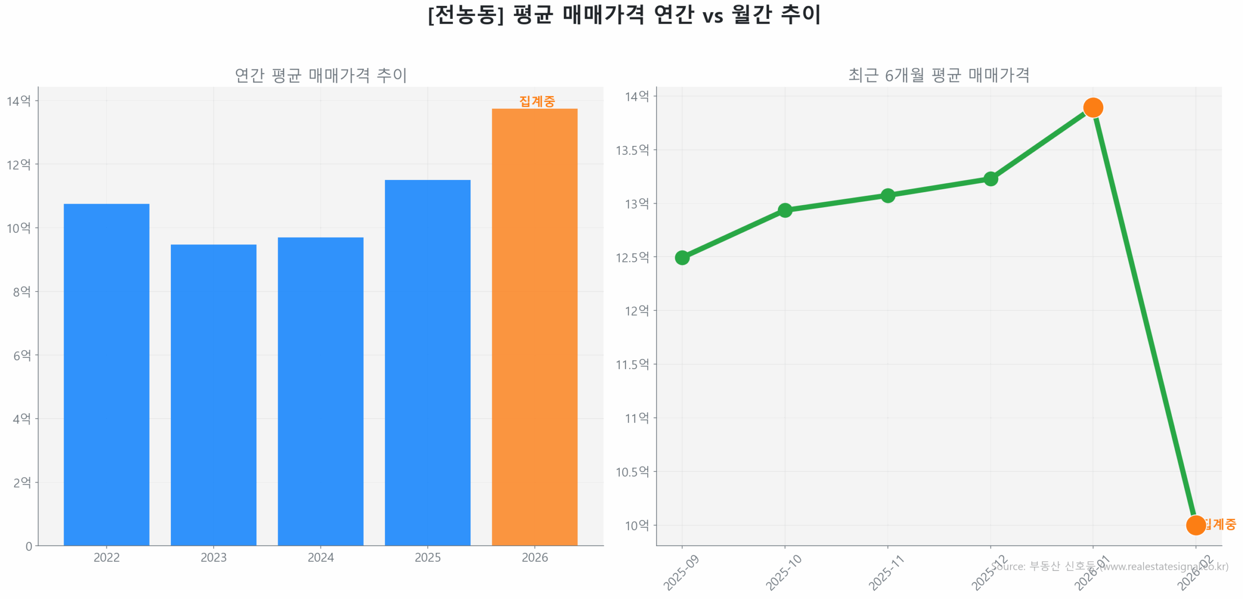 신고 시차를 보정한 2026년 1월 10일 확정치 기준, 전농동 아파트 전망은 역사적 저점 대비 100.0%의 반등을 기록하며 완전한 ‘회복(Recovery)’ 국면에 진입했습니다. 전년 동기 대비 매수 가속도는 15.0%로 측정되어 시장의 외형적 속도는 빨라지고 있으나, 2026년 1월 기록한 최고가 13억 8,919만 원 대비 약 3.5% 내외의 변동 폭 안에서 움직이며 고점 회복을 타진하는 모양새입니다. 현재의 흐름을 나타내는 Z-점수는 -0.2로, 이는 강력한 추세 전환이라기보다 정상적인 범위 내의 노이즈(Normal Noise)로 해석됩니다.