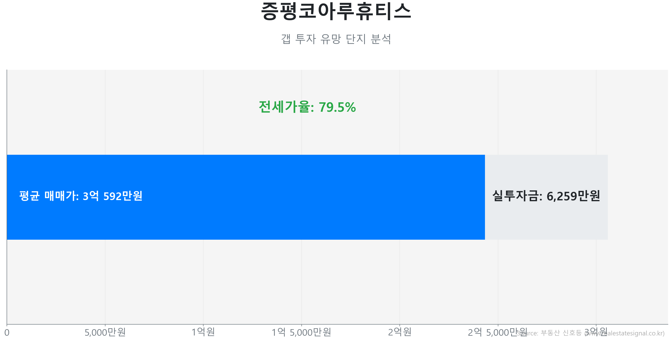 이어서 증평군 아파트 시세 상승을 주도하는 증평읍 증평코아루휴티스 (81.2㎡)는 전세가율 79.5%로 실투자금 약 6,259만 원이 소요되며, 향후 제3일반산업단지 조성 시 직주근접 수요를 최우선으로 흡수할 지역 내 랜드마크 신축 프리미엄 자산으로 평가받고 있습니다.