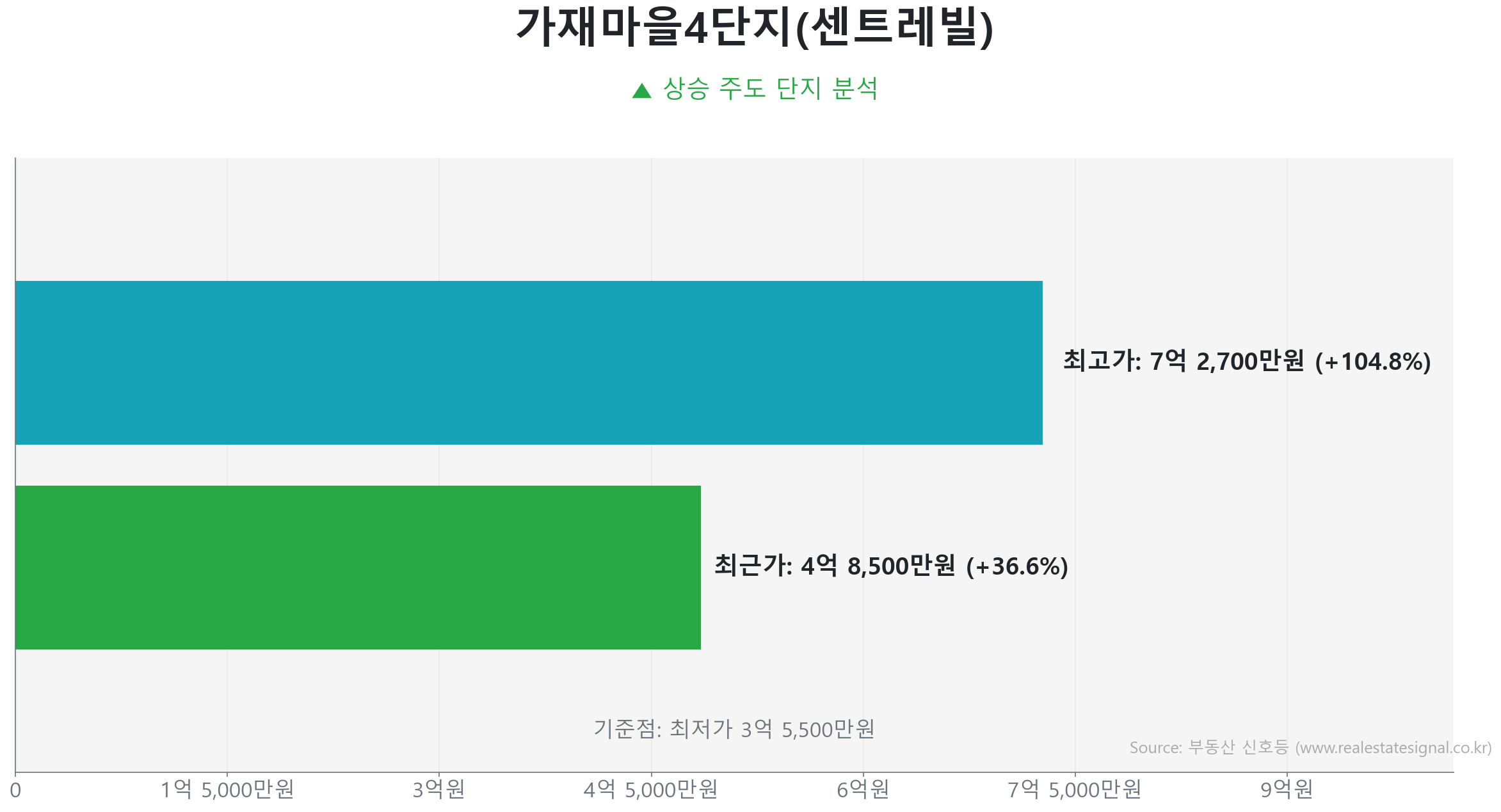이러한 가파른 회복 흐름은 철저히 가성비와 자본 회전율에 최적화된 557세대 규모의 종촌동 가재마을2단지 (59.0㎡)에서도 뚜렷하게 확인됩니다. 침체기에도 두터운 매수세를 형성하며 2026년 3월 6층 매물이 4억 2,000만 원에 거래되어 2억 9,000만 원이었던 과거 바닥 대비 44.8%라는 경이적인 반등률을 기록했습니다.