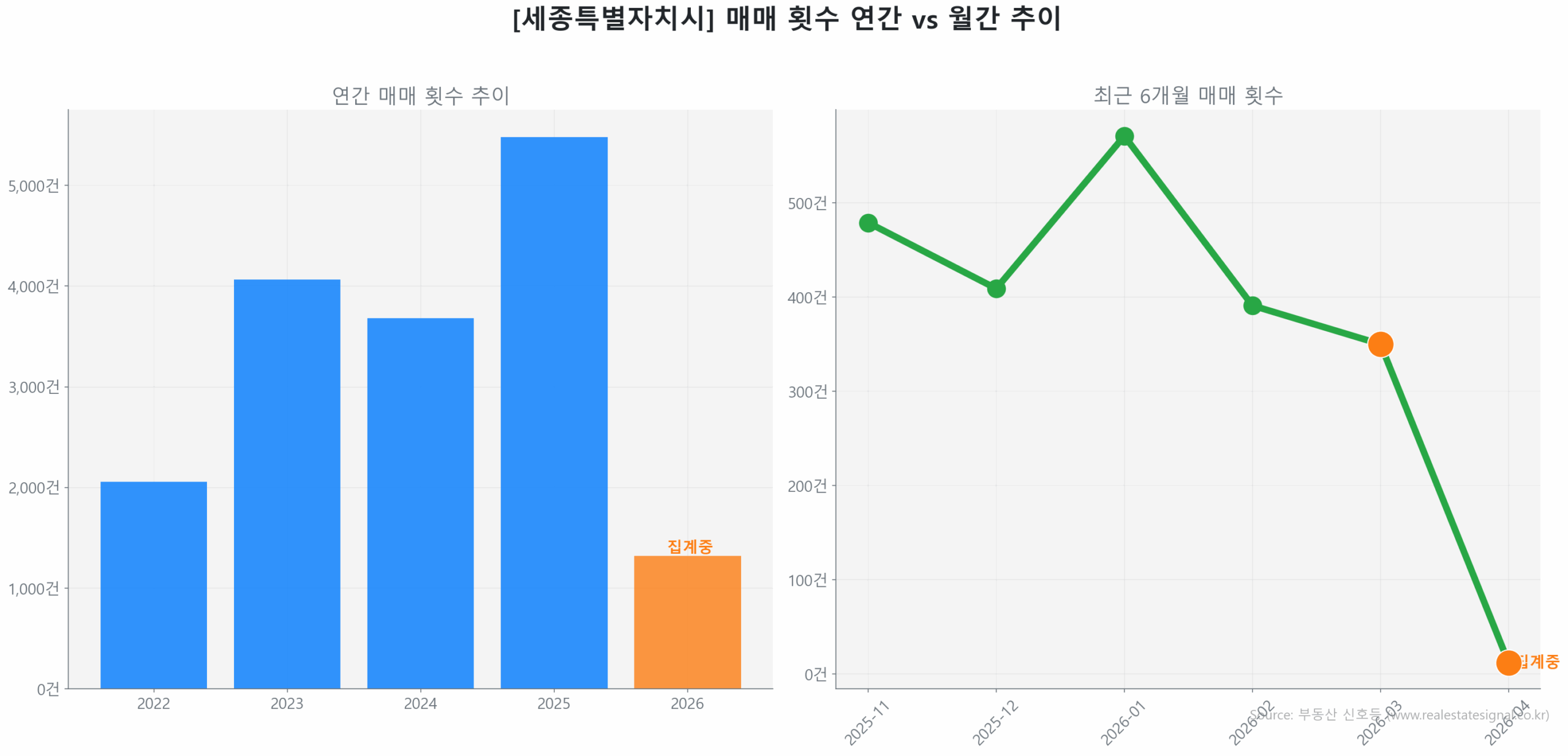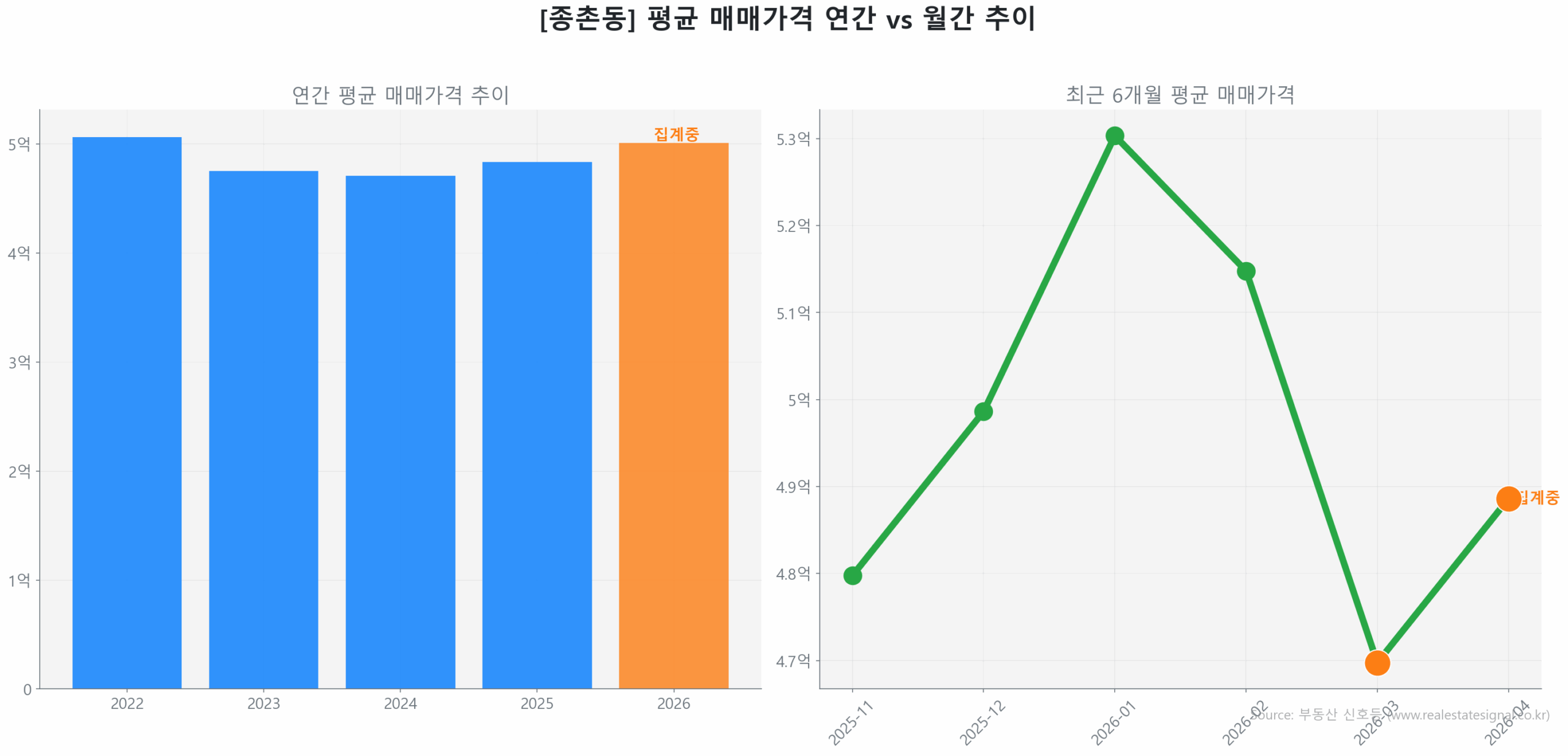 한편, 종촌동 중심 상권과 왕복 도로 하나를 사이에 둔 최상의 접근성을 갖춘 1,940세대 매머드급 대단지 종촌동 가재마을5단지 (59.0㎡)에서는 퇴근 후 생활 편의성을 중시하는 젊은 부부들의 매수세가 탄력적으로 반응하고 있습니다. 2026년 4월 20층 매물이 4억 5,300만 원에 거래돼 과거 저점 대비 30.6%의 반등세를 이끌고 있으며 연간 누적 거래량 72건을 기록 중입니다.