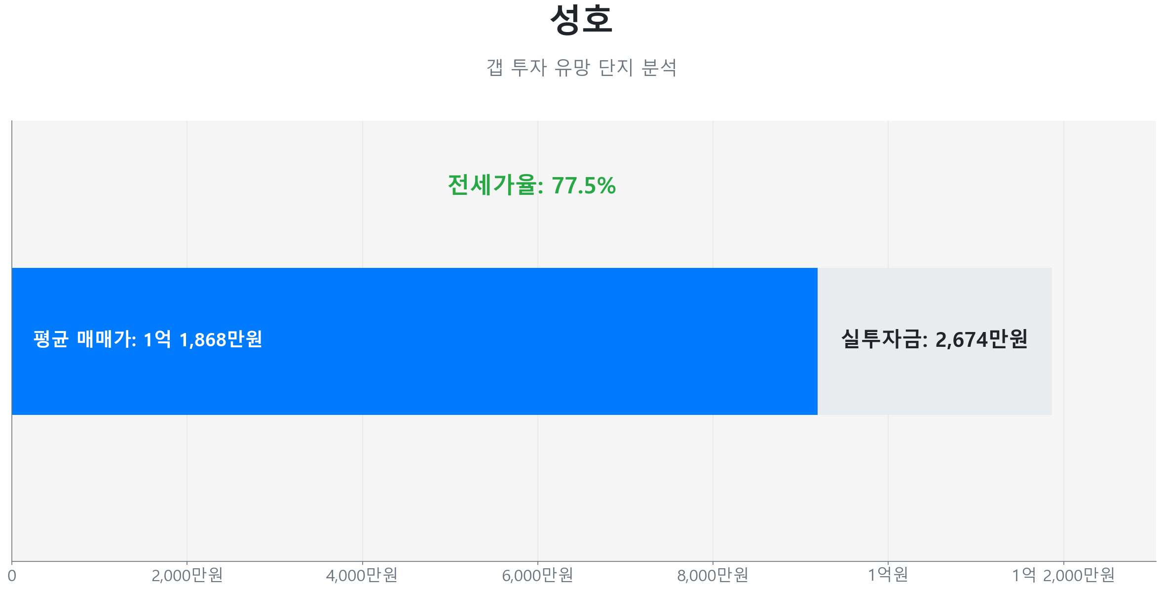 이어서 조양동 성호 49.0㎡ 타입(2001년 준공된 25년차 구축 매머드급 초대형 단지)은 전세가율 77.5%로, 실투자금 약 2,674만 원으로 소액 투자가 가능하며, 초등학교 접근성과 대단지 프리미엄으로 관리비가 저렴하다는 장점이 있습니다.