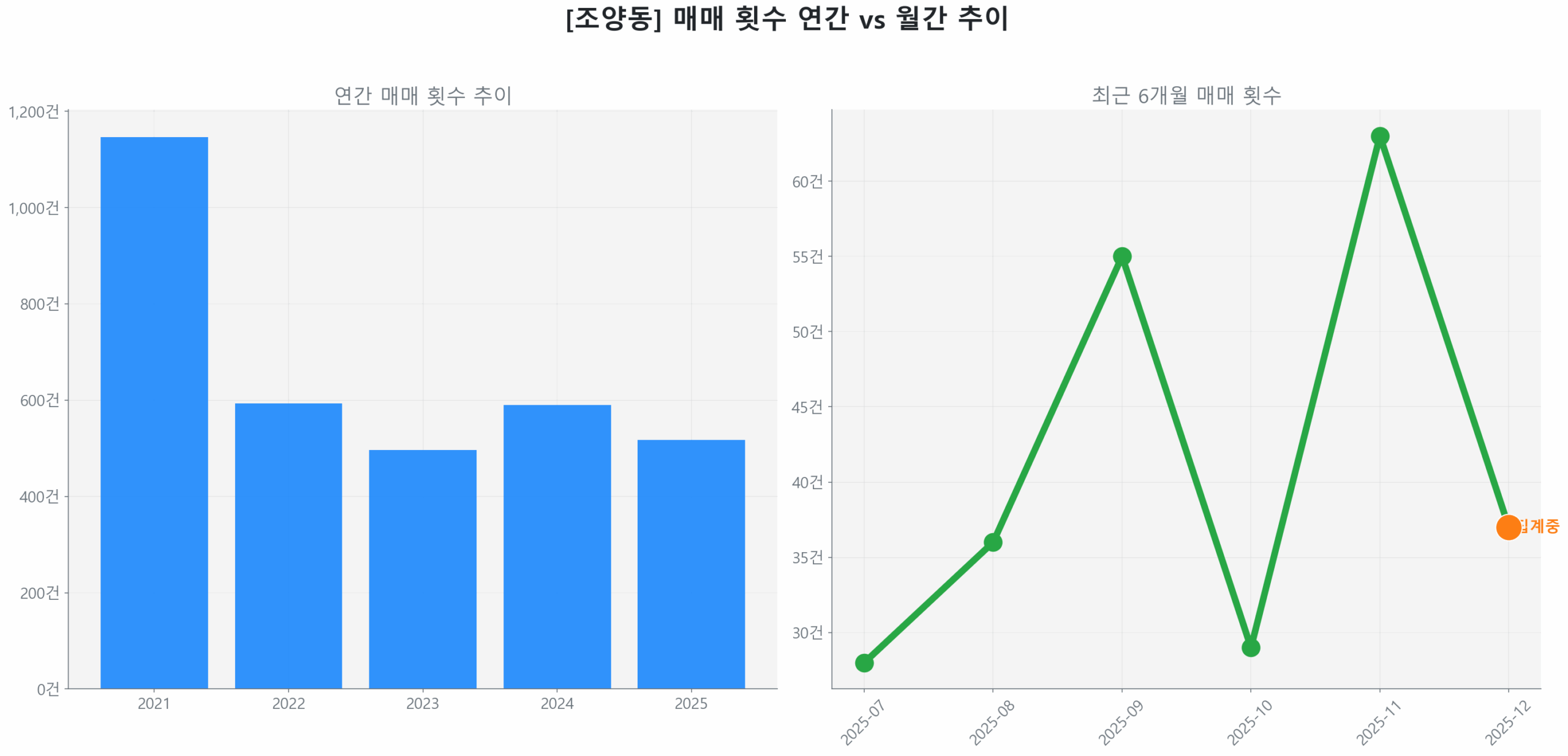 최신 실거래 데이터에 따르면, 2025년 9월~11월 거래량은 49건으로 전 분기 대비 53.1% 급증하며 활발한 움직임을 보였습니다. 특히 2025년 11월에는 전월 대비 117.2% 급등하며 변곡점을 만들었으나, 2025년 12월에는 37건으로 집계 중이며 숨고르기 양상입니다.