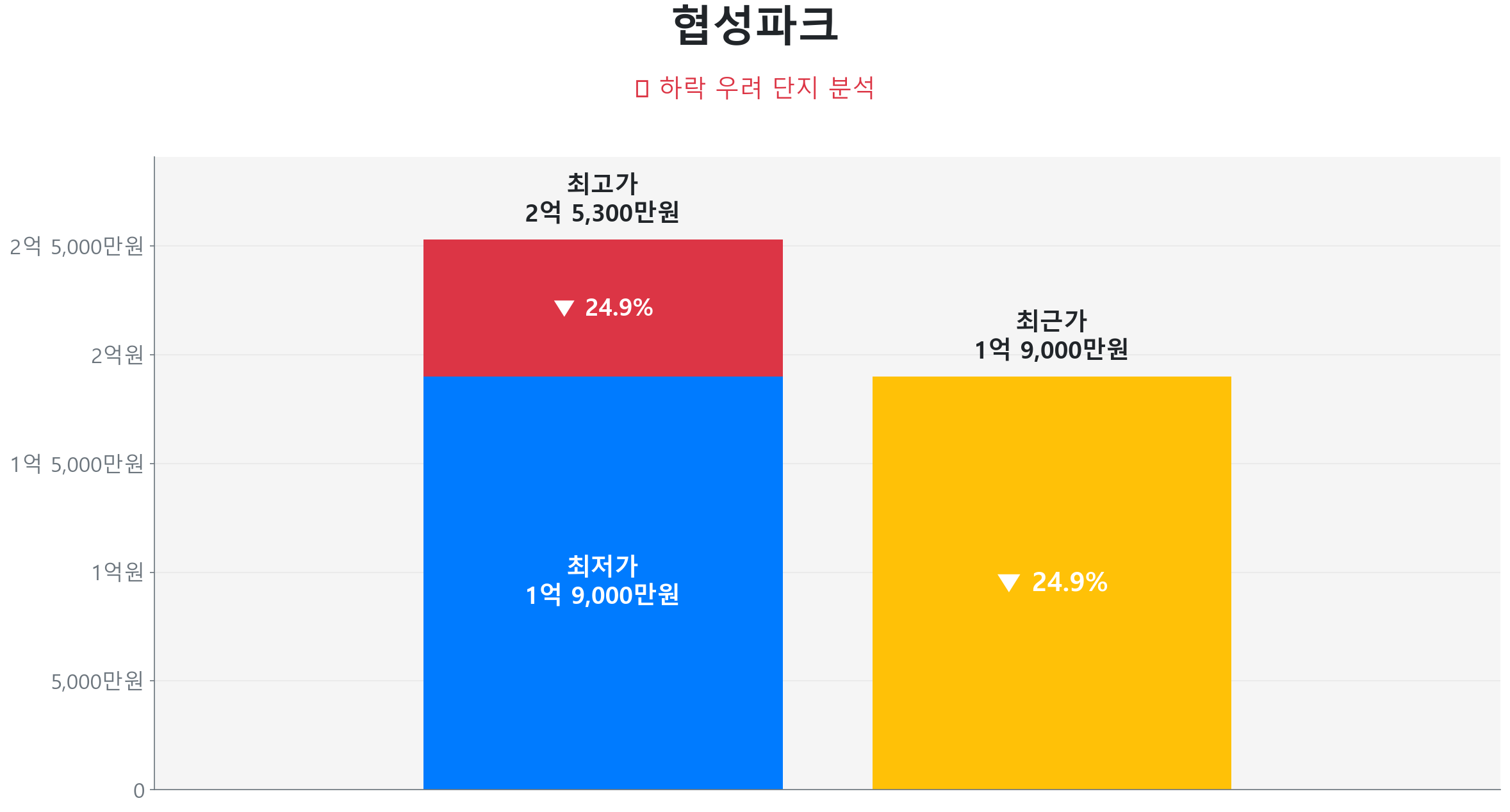 실제로 최근 2025년 12월에 14층 매물이 1억 9,000만 원에 거래되었습니다. 이는 2021년 11월에 기록된 역사적 고점 2억 5,300만 원 대비 24.9% 하락한 수준입니다. 참고로 2024년 11월에는 1억 9,000만 원(103동 5층)까지 하락하며 바닥을 찍었으나, 최근 거래가는 당시와 동일한 수준을 유지하고 있습니다.