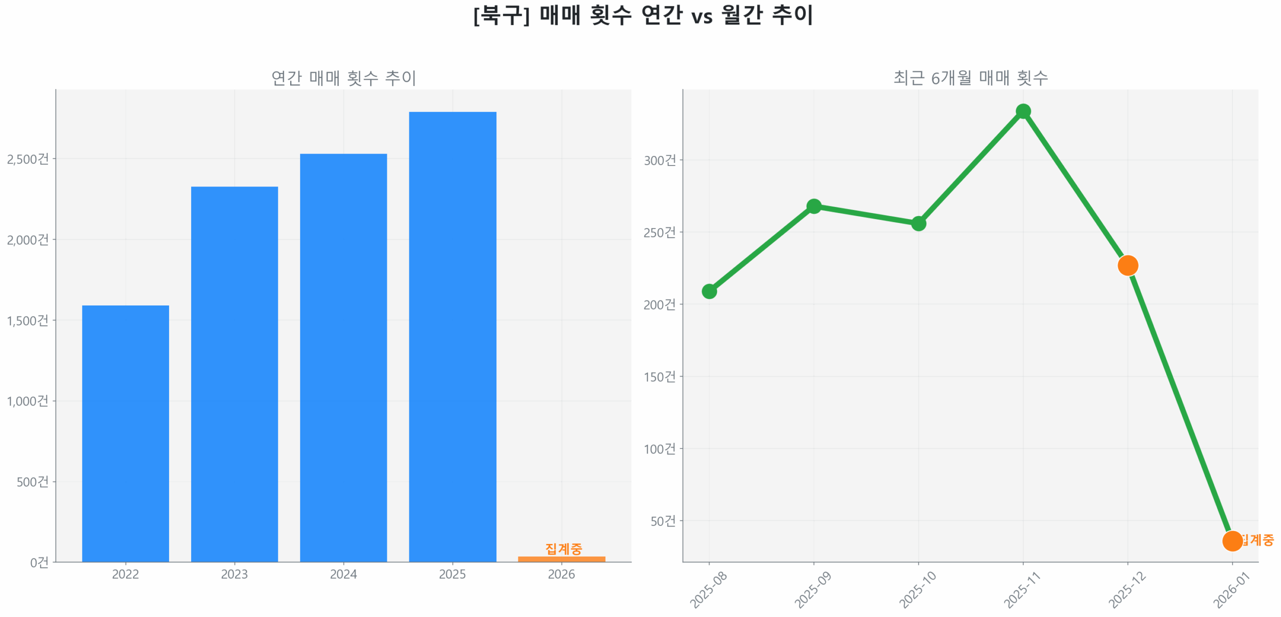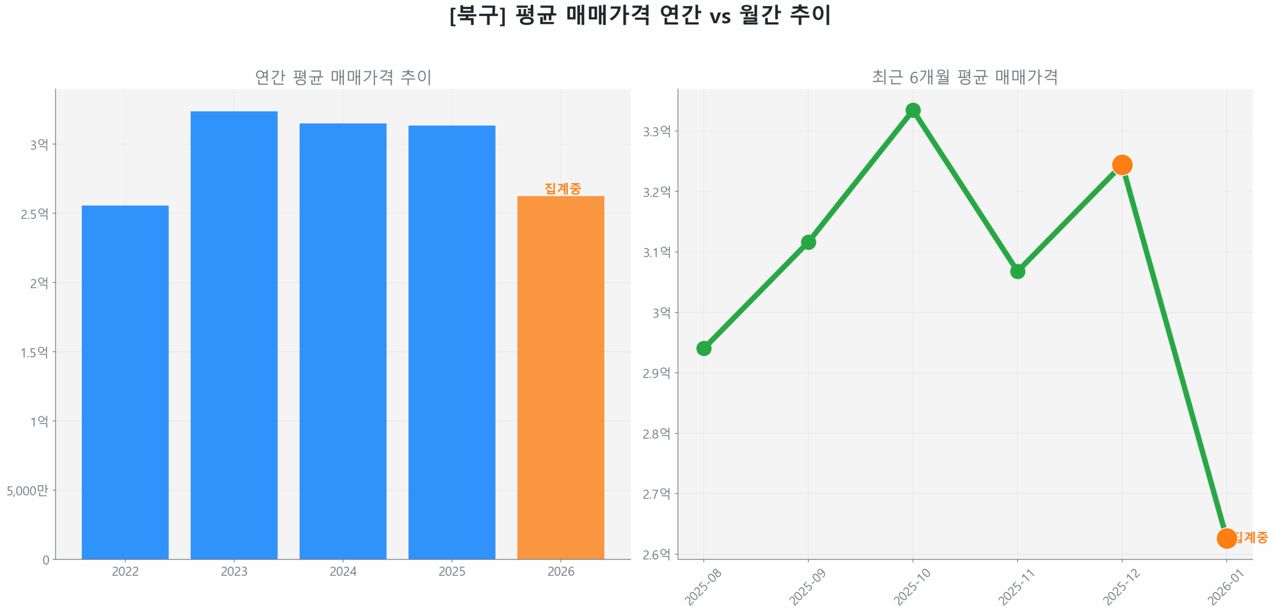 최근 3개월(2025년 10월 ~ 2025년 12월)간 거래량은 60건으로 전 분기 대비 41.1% 급증하며 활발한 매수세를 보였으나, 같은 기간 평균 가격은 2억 5,856만 원으로 8.2% 하락하는 이례적인 가격-거래량 비동조화 현상이 나타났습니다.