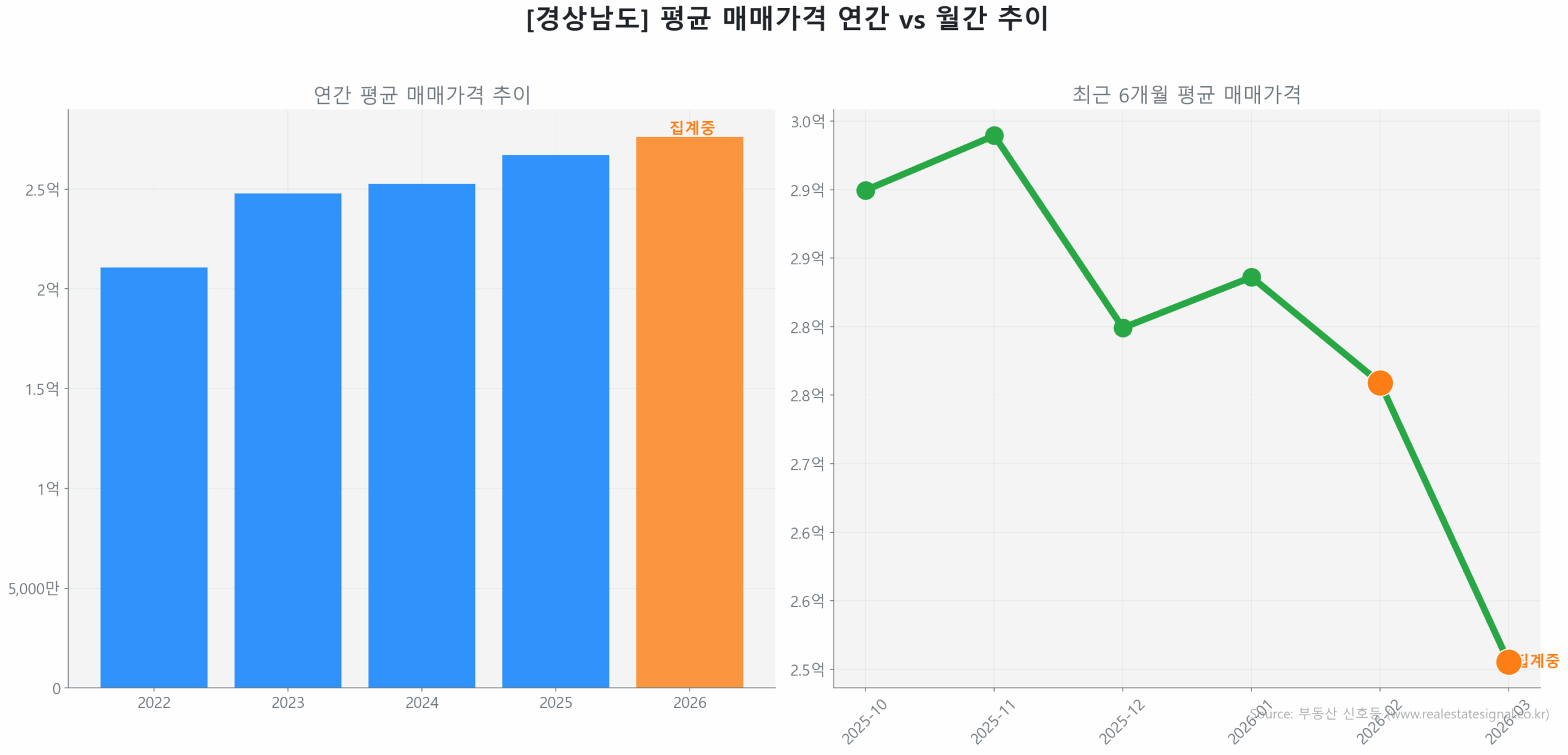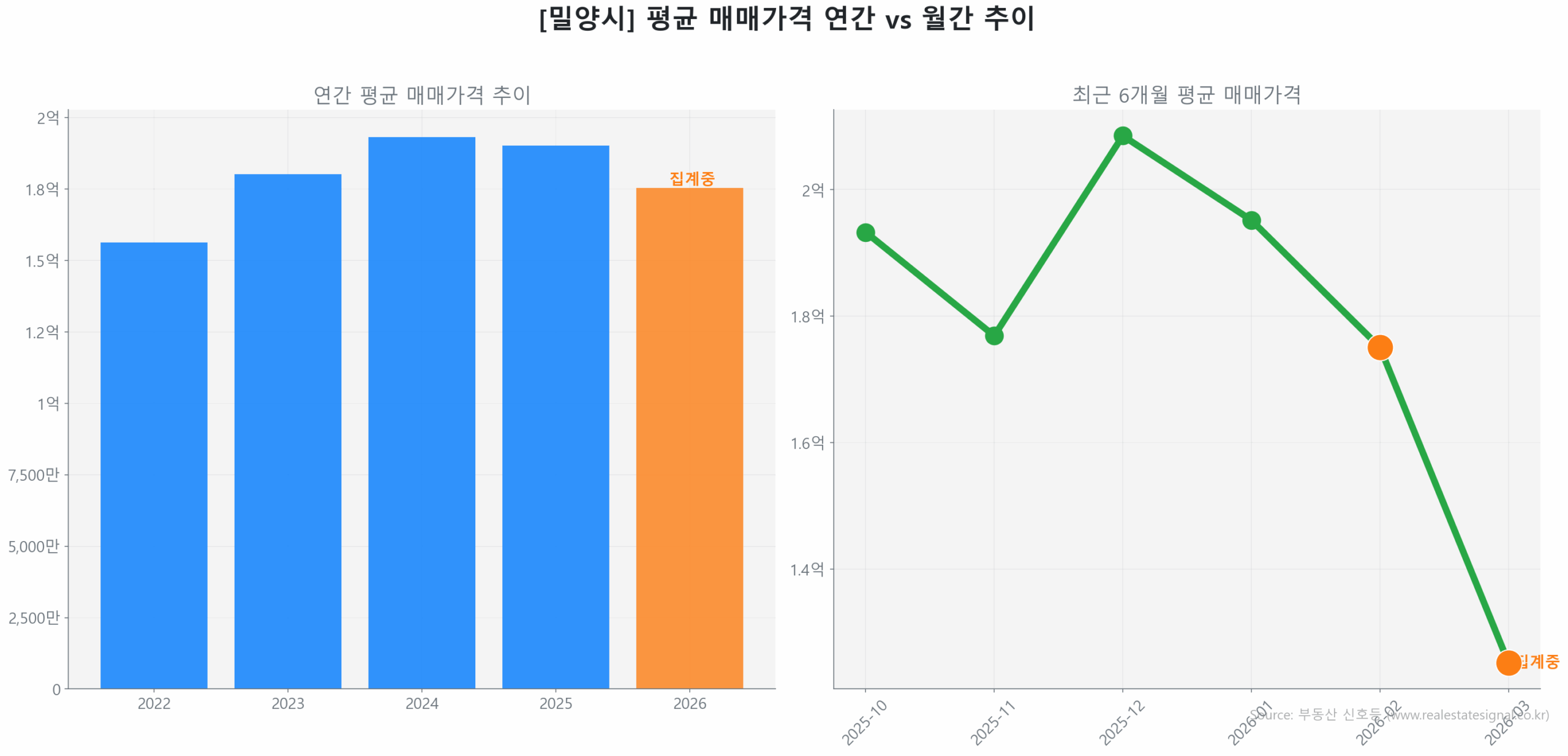 현재 밀양 아파트 시세는 역사적 저점 대비 51.7% 반등을 기록하며 명확한 ‘회복(Recovery)’ 국면에 진입해 있습니다. 신고 시차 30일을 보정한 2026년 2월 19일 확정치 데이터와 3월 잠정치를 교차 검증한 결과, 2024년 10월 기록한 역사적 고점(2억 2,175만 원) 대비 하락폭의 절반 이상을 회복하며 안정적인 궤도에 올라선 모습입니다.