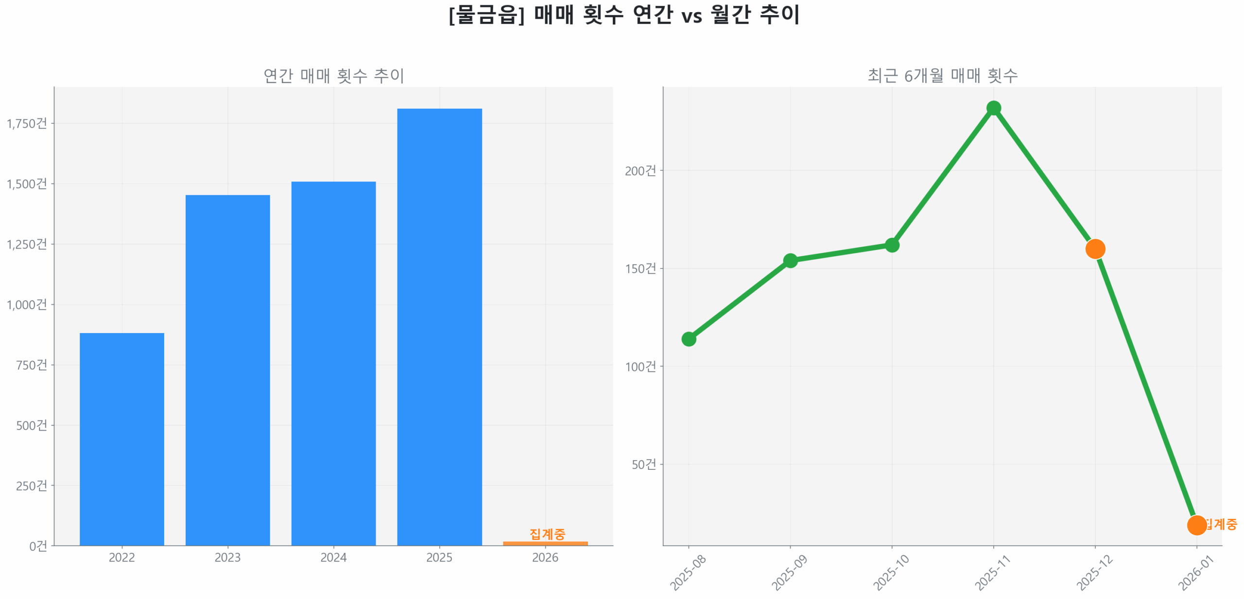 최신 실거래 데이터에 따르면, 최근 3개월간(2025년 10월~12월) 거래량은 184건으로 전 분기 대비 48.5% 급증하며 시장의 활력이 높아졌습니다. 특히 2025년 11월에 거래량이 급등하며 변곡점을 만들었으나, 2026년 1월(집계 중)에는 19건으로 잠정 집계되어 숨 고르기 양상도 보입니다.