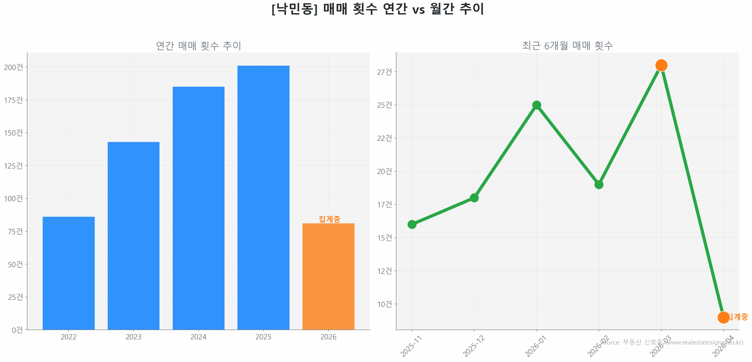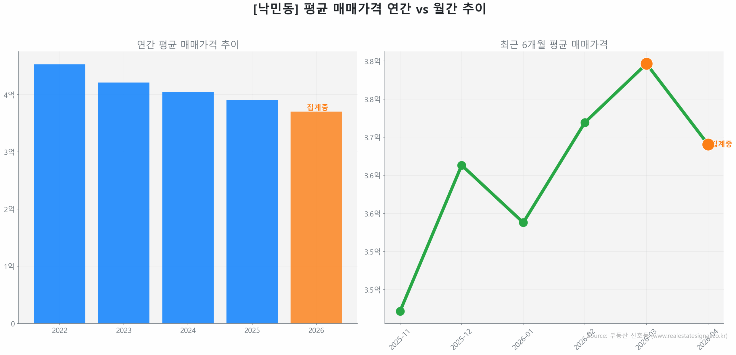 종합적으로 낙민동 시장은 구축 중심의 물량 소화와 비규제 이점을 활용한 자본 유입이 동시에 나타나는 ‘선별적 회복 초기 국면’에 자리하고 있습니다.
