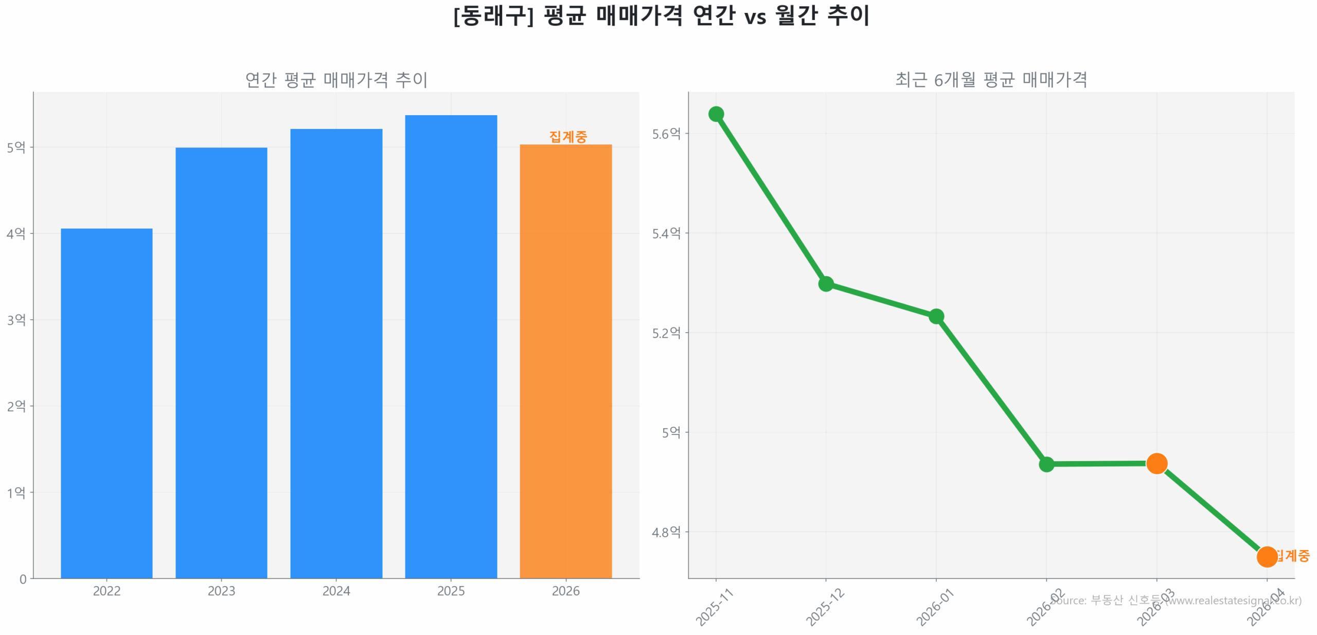 한편, 준공 19년 차인 낙민동 한일유앤아이 (84.0㎡)에서는 꾸준한 실거주 수요를 바탕으로 2026년 4월 4억 9,000만 원에 거래되며 최저점 대비 17.5% 반등하는 숨고르기 장세가 관찰됩니다.